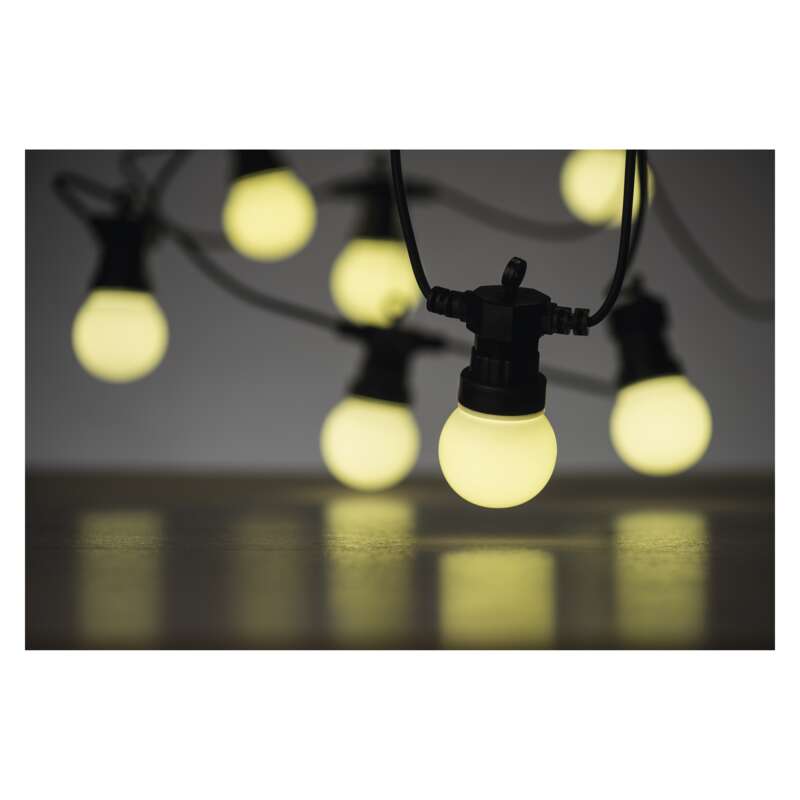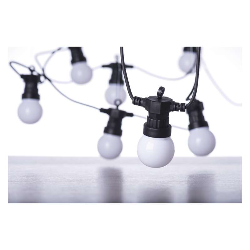 LED světelný řetěz – 10x párty žárovky mléčné, 5 m, venkovní i vnitřní, teplá bílá == barva drátu: černá|barva světla: teplá bílá|časovač: ne|dálkový ovladač: ne|délka přívodu: 5 m|krytí: IP44|materiál: plast|počet LED: 50|použití: venkovní i vnitřní|příkon: 5 W|prodejní obal: 1 ks, krabice|produkt: girlanda|rozměr: 5 m|typ napájení: síťový adaptér|vstupní napětí: 230 V AC|výstupní napětí: 24 V DC|záruční doba: 2 roky|zdroj svícení: LED|životnost: 10 000 hodin