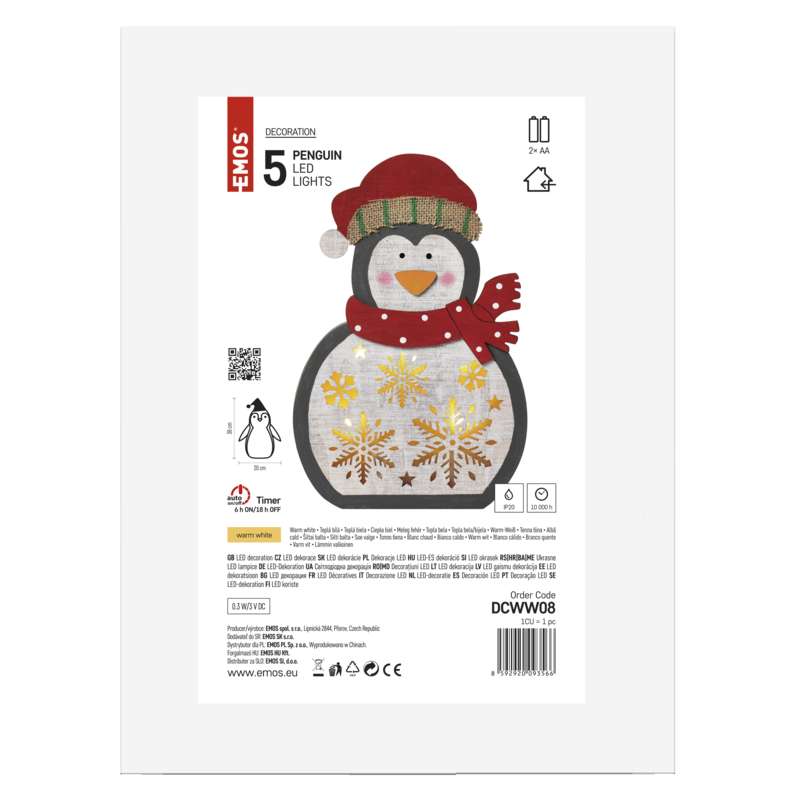 LED vánoční tučňák dřevěný, 30 cm, 2x AA, vnitřní, teplá bílá, časovač *DCWW08