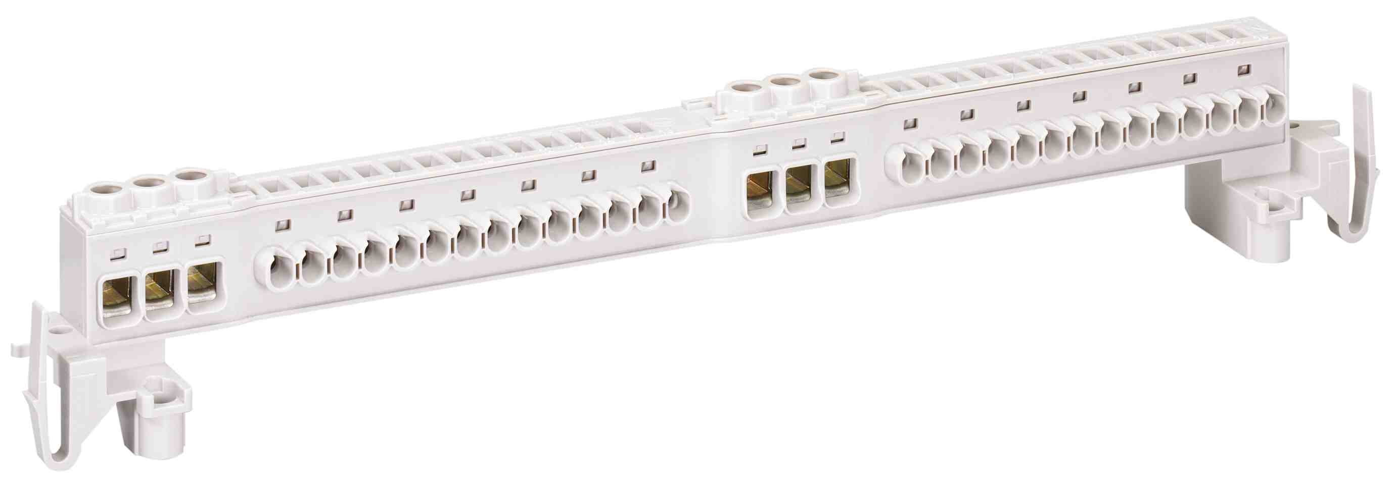Bezšroubová upínací lišta PE/N, k montáži do malých rozvaděčů AK od AK 14 a prázdná skříň AKL/Aki jako dodatečné svorky nebo pro případ náhrady, jednostupňová upínací lišta PE/N, vždy se, 3 šroubovými místy upnutí 2,5mm? - 16mm? a, 14 bezšroubových upínacích míst, 1,5 - 4 mm? Rozměry: 286 x 60 x 50 mm