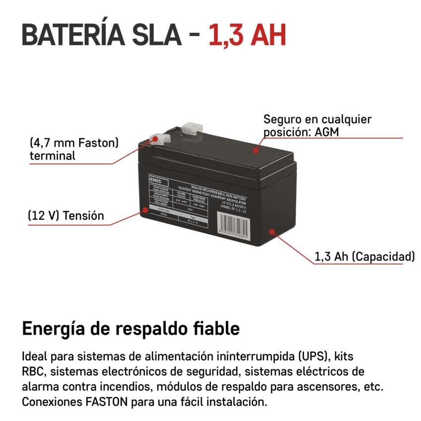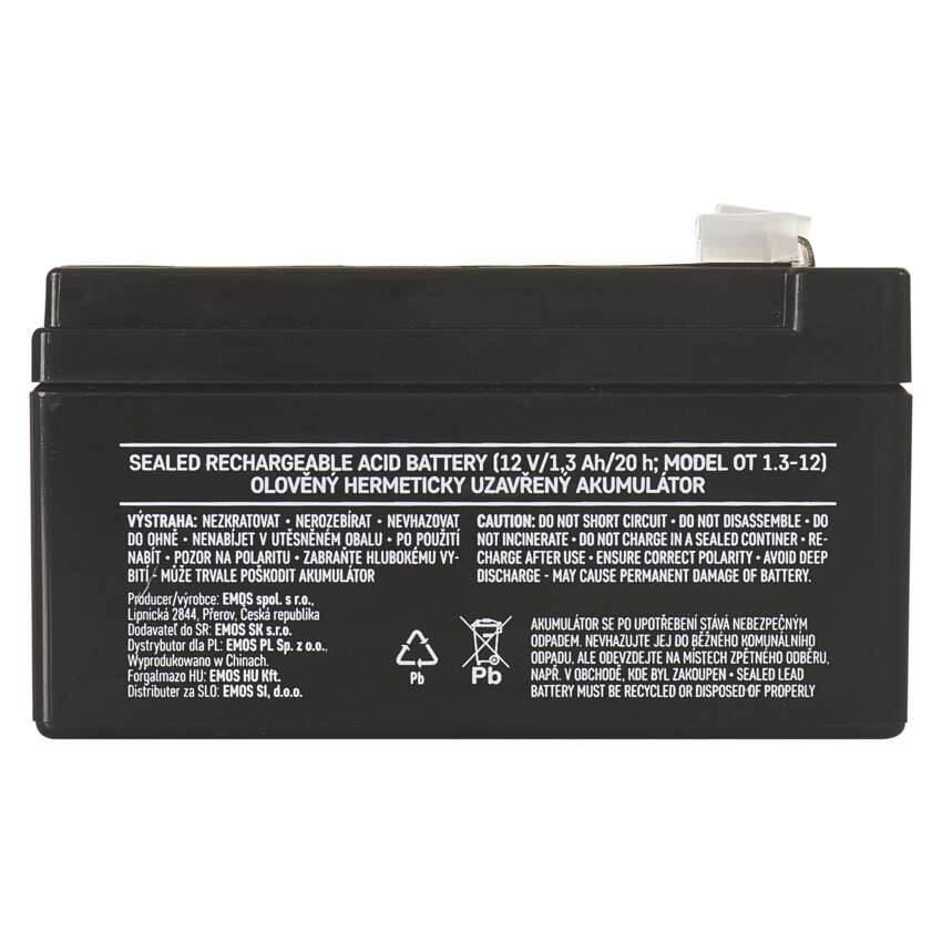 Bezúdržbový olověný akumulátor 12 V/1,3 Ah, faston 4,7 mm == bezúdržbový: ano|chemické složení: Pb|dětská vozítka - např. Peg-Pérego: ne|EPS (elektronické požární systémy): ano|EZS (elektronické zabezpečovací systémy): ano|hmotnost: 0,5 kg|kapacita: 1,3 Ah|nabíjecí svítilny: ne|napětí: 12 V|nouzové osvětlení: ne|optimální životnost: 5 let|PARADOX: ne|prodejní obal: 1 ks|rozměr: 97 × 45 × 53 mm|rybáři - echoloty, sonary, napájení motoru lodí: ano|technologie: AGM|terminál: faston 4,7 mm|UPS (záložní zdroje): ne|ÚSTŘEDNY JABLOTRON JA100K: ne|ÚSTŘEDNY JABLOTRON JA106K: ne|ÚSTŘEDNY JABLOTRON JA106K(R): ne|ÚSTŘEDNY JABLOTRON JA82K: ne|ÚSTŘEDNY JABLOTRON JA83: ne|zahradní traktory: ne|záložní baterie pro výtahy - osvětlení, hovor: ano