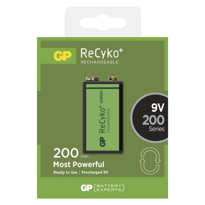 Nabíjecí baterie GP ReCyko 200 (9V) == chemické složení: NiMH|hmotnost: 42,5 g|kapacita: 200 mAh|kategorie/řada: ReCyko|max. skladovatelnost: neuvádí se|možnost nabíjení: ano|napětí: 8,4 V|počet nabíjecích cyklů: více než 1 000|prodejní obal: 1 ks, papírová krabička|provozní teplota: -20 °C až +50 °C|rozměr: 26,5 × 15,7 × 48,5 mm|typ: 6HR61 9 V (1604)|velikost baterie: 9 V|značka: GP