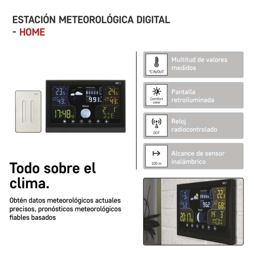 Domácí bezdrátová meteostanice E6018 == 12/24 formát času: ano|anemometr: ne|barevný displej (black mask) podsvícený: ano|barometr: ano|budík: ano, 2×|časová pásma: ano|datum: ano|dosah čidla: až 100 m|drátová sonda k čidlu: ne|elektronické plošné podsvícení: ano|fáze měsíce: ano|hodiny: řízené DCF signálem|kalendář: ano|korekce nadmořské výšky: ano|LED podsvícení displeje: ano|min. a max. teplota: ano|možné další čidlo: až 3 čidla (E06018)|možnost nastavení jednotky teploty: °C/°F|možnost pověšení na zeď: ano|napájení čidla: 2× 1,5 V AAA (nejsou součástí balení)|napájení stanice: 3× 1,5 V AAA (nejsou součástí balení)|opakované buzení: ano|předpověď počasí: ano|přenosová frekvence: 433 MHz|prodejní obal: 1 ks, krabička|produkt: meteostanice|projekce: ne|provedení: bezdrátové|rozměr čidla: 15 × 62 × 100 mm|rozměr hlavní jednotky: 17 × 192 × 127 mm|síťový adaptér: ano, 5 V DC/300 mA (součástí balení)|srážkoměr: ne|teplotní výstraha: ano|trend teploty: ano|trend tlaku: ano|trvalé podsvícení: ano|velikost displeje: 168 × 93 mm|venkovní teplota: -50 °C až +70 °C, rozlišení 0,1 °C|venkovní vlhkost: 1 % až 99 % RV, rozlišení 1 %|vnitřní teplota: -10 °C až +50 °C, rozlišení 0,1 °C|vnitřní vlhkost: 1 % až 99 % RV, rozlišení 1 %