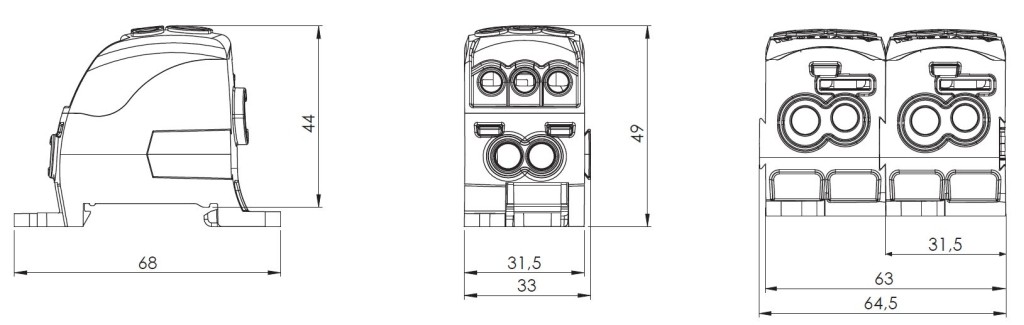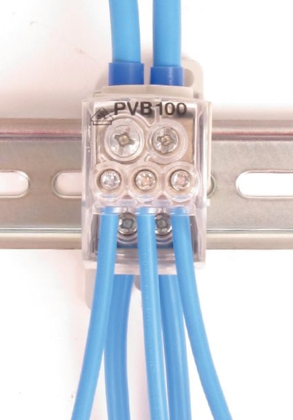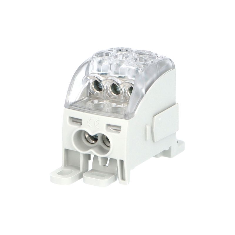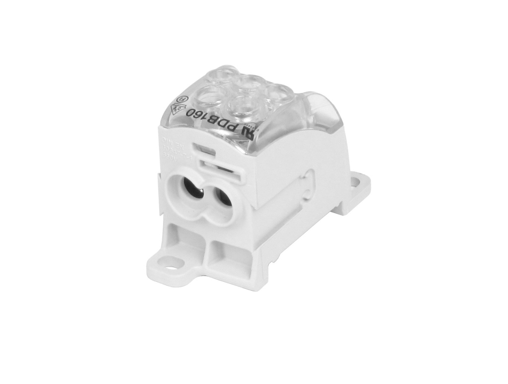 Blok pro rozdělení fází PDB 160 (dříve značeno PVB 100), 1pólový, pro CU vodiče, jmenovitý proud 160A, jmenovité napětí 690V, barva šedá / průhledné víko, montáž na DIN lištu / PANEL, krytí IP20, vstup 1x25mm2, výstup 3x16mm2, 3x10mm2.