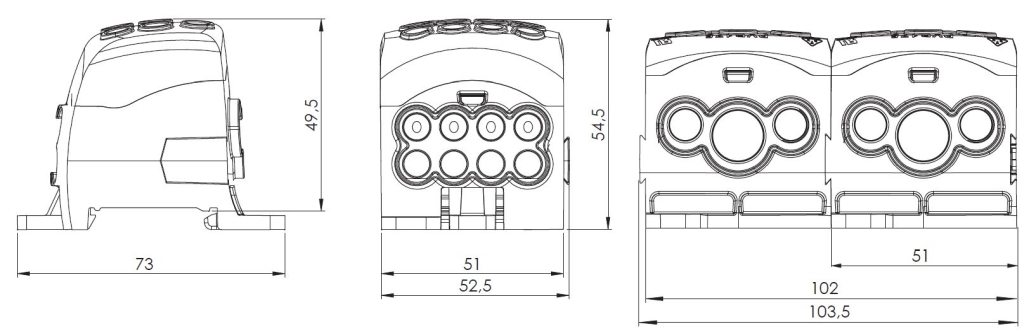 Blok pro rozdělení fází PDB 270 (dříve značeno PVB 230), 1pólový, pro CU vodiče, jmenovitý proud 270A, jmenovité napětí 690V, barva šedá / průhledné víko, montáž na DIN lištu / PANEL, krytí IP20, vstup 1x95mm2, výstup 2x35mm2, 8x25mm2.