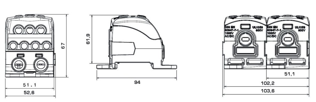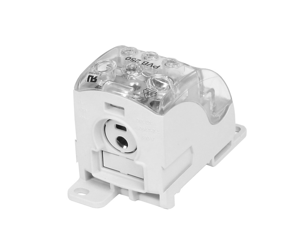 Blok pro rozdělení fází PDB 400 (dříve značeno PVB 250), 1pólový, pro CU vodiče, jmenovitý proud 400A, jmenovité napětí 690V, barva šedá / průhledné víko, montáž na DIN lištu / PANEL, krytí IP20, vstup 1x120mm2 a 24x10mm plochý vodič, výstup 2x35mm2, 3x25mm2, 4x16mm2.