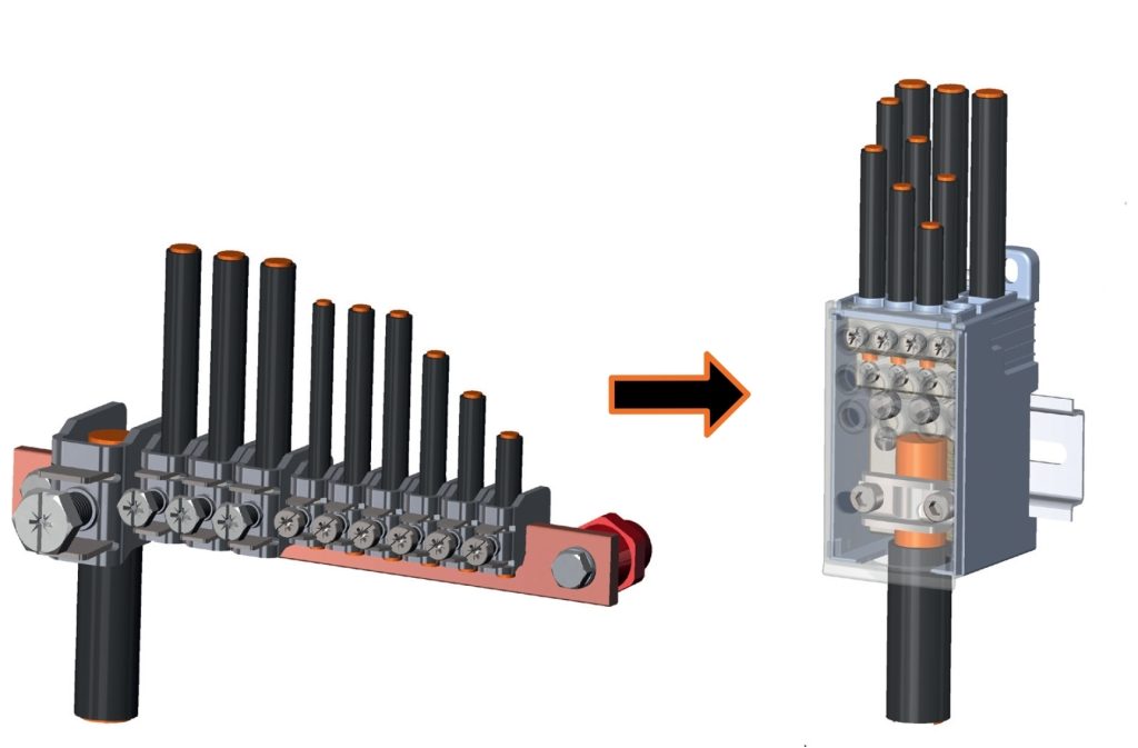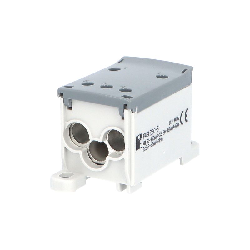 Blok pro rozdělení fází PVB 250-3, 1pólový, pro AL/CU vodiče, jmenovitý proud 250A, jmenovité napětí 690V, barva šedá, montáž na DIN lištu / PANEL, krytí IP20, vstup 1x185mm2, výstup 6x35mm2.