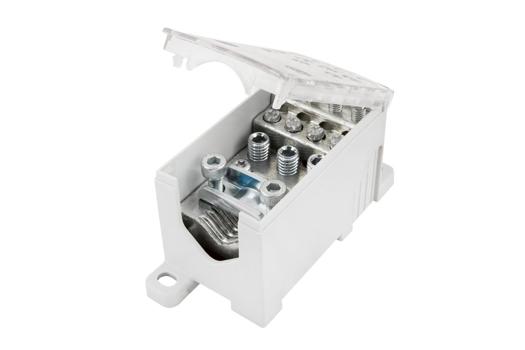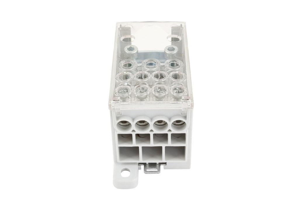 Blok pro rozdělení fází PVB 250-3/8, 1pólový, pro AL/CU vodiče, jmenovitý proud 250A, jmenovité napětí 690V, barva šedá, montáž na DIN lištu / PANEL, krytí IP20, vstup 1x120mm2, výstup 3x35mm2, 8x16mm2.