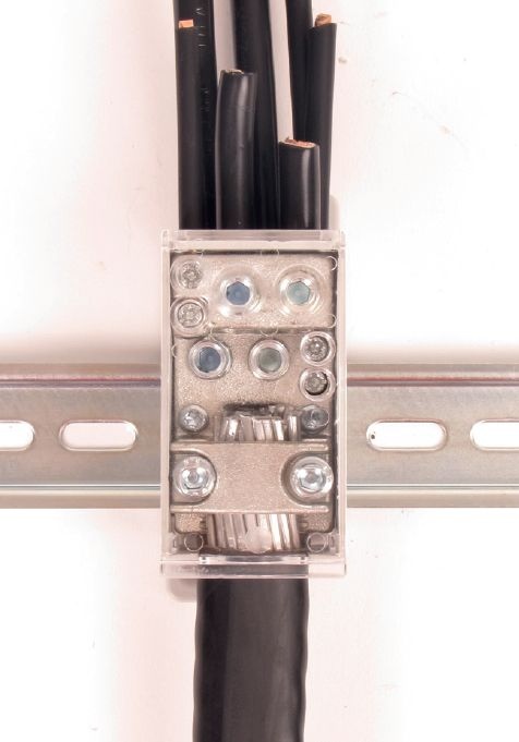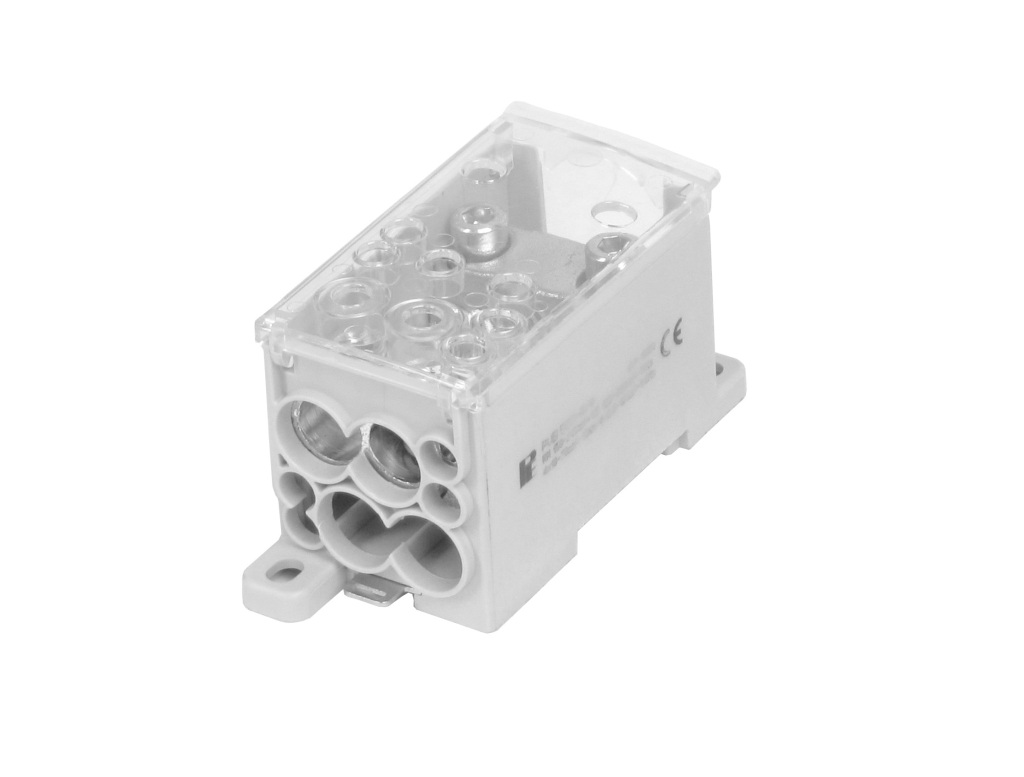 Blok pro rozdělení fází PVB 500-4/4, 1pólový, pro AL/CU vodiče, jmenovitý proud 500A, jmenovité napětí 690V, barva šedá, montáž na DIN lištu / PANEL, krytí IP20, vstup 1x240mm2, výstup 4x70mm2, 4x16mm2.