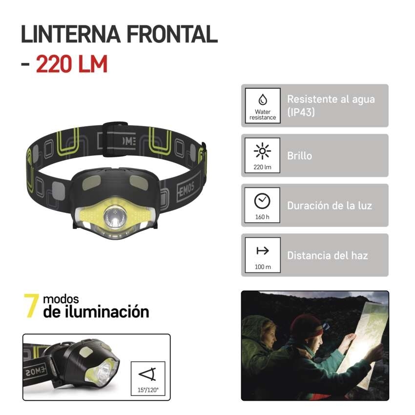 COB LED + LED čelovka P3536, 220 lm, 100 m, 3× AAA == barva: černá|baterie součástí balení: ne|doba nabíjení: neuvádí se|doba svícení: 45–160 h|doba svícení detail: COB LED + LED 100 % – 45 h, LED 100 % – 70 h, LED 50 % – 160 h, COB LED 100 % – 65 h|dosvit: COB LED + LED 100 % – 100 m, LED 100 % – 100 m, LED 50 % – 50 m, COB LED 100 % – 20 m|fokus: ne|hmotnost: 65 g/100 g|LED indikace nabíjení: neuvádí se|LED indikace stavu akumulátoru: neuvádí se|materiál: ABS plast|maximální dosvit: 100 m|maximální světelný tok: 220 lm|nabíjecí: ne|napájení: 3× AAA|nárazuvzdornost: ano|počet režimů svícení: 7|příslušenství: neuvádí se|prodejní obal: 1 ks, papírový blistr|reflexní pásek: ano|režimy svícení: COB LED + LED 100 %, LED 100 %, LED 50 %, blikání, COB LED – bílá, COB LED – červená, COB LED – zelená|rozměr: 65 × 45 × 50 mm|speciální funkce: funkce rychlého vypnutí|světelný tok: COB LED + LED 100 % – 220 lm, LED 100 % – 110 lm, LED 50 % – 25 lm, COB LED 100 % – 155 lm|typ baterie: LR03 (1,5 V)|typ napájecího konektoru: neuvádí se|úhel vyzařování: 15°/120°|voděodolnost: ano (IP43)|vybavení: luminescenční tlačítka|záruční doba: 2 roky|zdroj světla: LED + COB LED (zelená, červená)|značka: EMOS