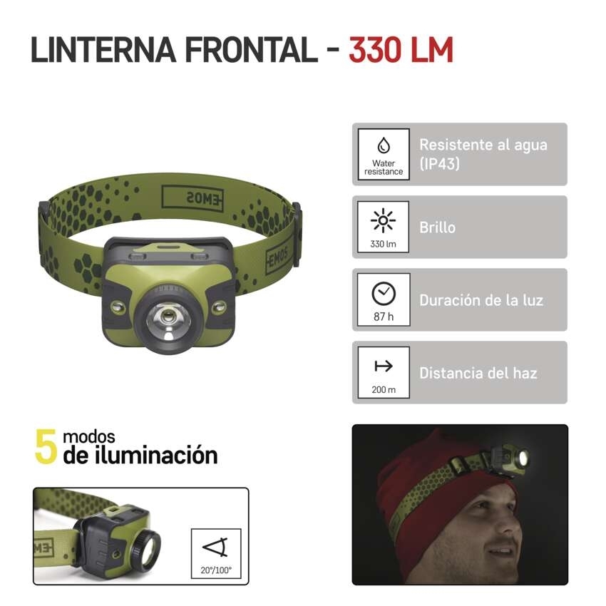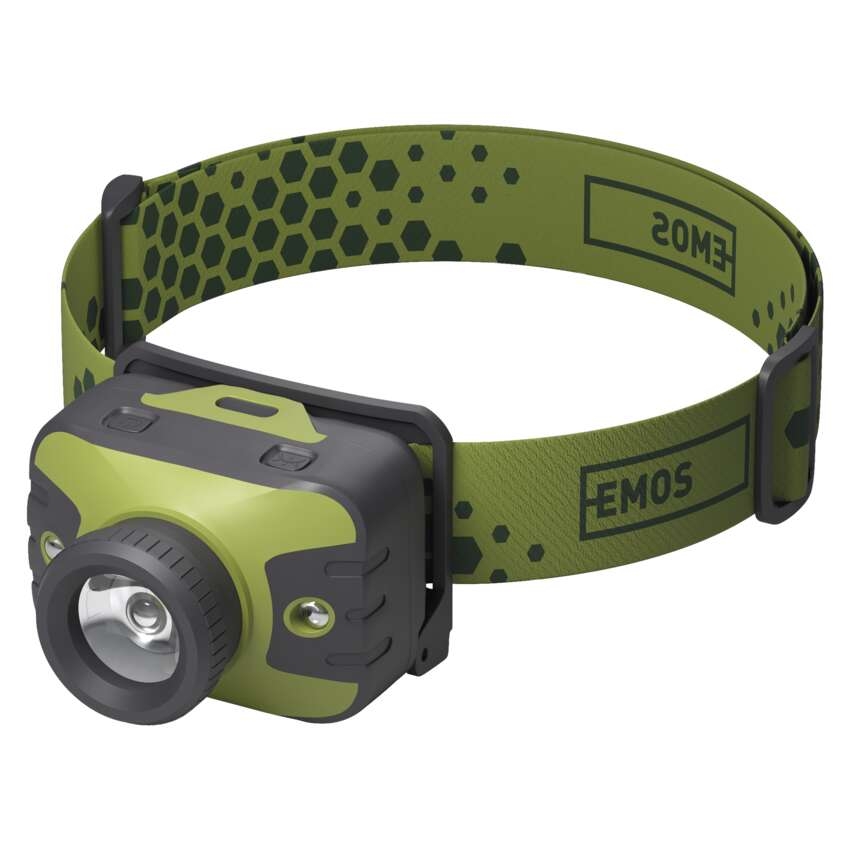CREE LED čelovka P3539, 330 lm, 200 m, 3× AAA == barva: zeleno-černá|baterie součástí balení: ne|doba nabíjení: neuvádí se|doba svícení: 50–87 h|doba svícení detail: CREE LED 100 % – 50 h, CREE LED 50 % – 87 h|dosvit: CREE LED 100 % – 200 m, CREE LED 50 % – 140 m|fokus: ano|hmotnost: 70 g/105 g|LED indikace nabíjení: neuvádí se|LED indikace stavu akumulátoru: neuvádí se|materiál: plast + pogumováno|maximální dosvit: 200 m|maximální světelný tok: 330 lm|nabíjecí: ne|napájení: 3× AAA|nárazuvzdornost: ano|počet režimů svícení: 5|příslušenství: neuvádí se|prodejní obal: 1 ks, papírový blistr|reflexní pásek: ne|režimy svícení: CREE LED 100 %, CREE LED 50 %, SOS, červené LED svícení, červené LED blikání|rozměr: 60 × 48 × 43 mm|speciální funkce: rychlé vypnutí, ochrana bat., fokus|světelný tok: CREE LED 100 % – 330 lm, CREE LED 50 % – 170 lm|typ baterie: LR03 (1,5 V)|typ napájecího konektoru: neuvádí se|úhel vyzařování: 20°/100°|voděodolnost: ano (IP43)|vybavení: neuvádí se|záruční doba: 2 roky|zdroj světla: CREE LED + 2× červená LED|značka: EMOS
