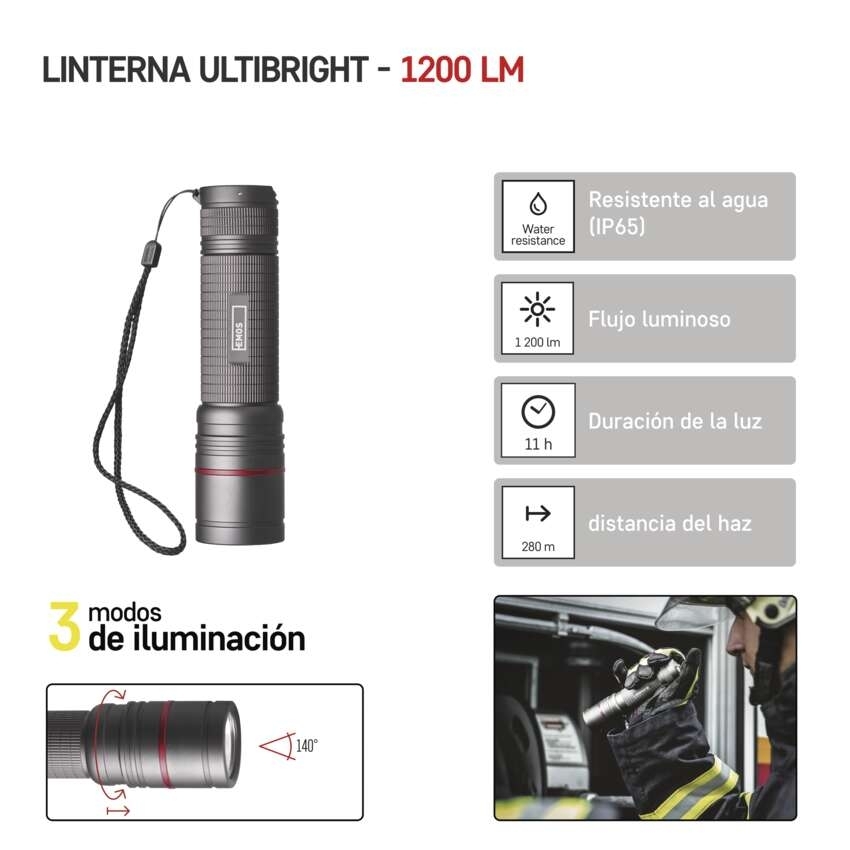 CREE LED nabíjecí kov. svítilna Ultibright 90, 1200lm == barva: šedá|baterie součástí balení: ano|doba nabíjení: 11,5 h|doba svícení: 3–11 h|doba svícení detail: CREE LED 100 % – 3 h, CREE LED 50 % – 4,5 h, CREE LED 20 % – 11 h|dosvit: CREE LED 100 % – 280 m, CREE LED 50 % – 200 m, CREE LED 20 % – 130 m|fokus: ano (šroubovací)|hmotnost: 203 g|LED indikace nabíjení: ano|LED indikace stavu akumulátoru: ne|materiál: hliník|maximální dosvit: 280 m|maximální světelný tok: 1 200 lm|nabíjecí: ano|napájení: Li-Ion 26650|nárazuvzdornost: ano|počet režimů svícení: 3|příslušenství: pouzdro|prodejní obal: 1 ks, krabice|režimy svícení: CREE LED 100 %, CREE LED 50 %, CREE LED 20 %|rozměr: 157 × 40 × 40 mm|speciální funkce: funkce rychlého vypnutí, funkce ochrany baterie|světelný tok: CREE LED 100 % – 1 200 lm, CREE LED 50 % – 600 lm, CREE LED 20 % – 260 lm|typ baterie: 5 000 mAh/3,7 V|typ napájecího konektoru: USB C|voděodolnost: ano (IP65)|vybavení: poutko|záruční doba: 3 roky|zdroj světla: CREE LED|značka: EMOS