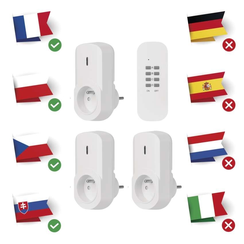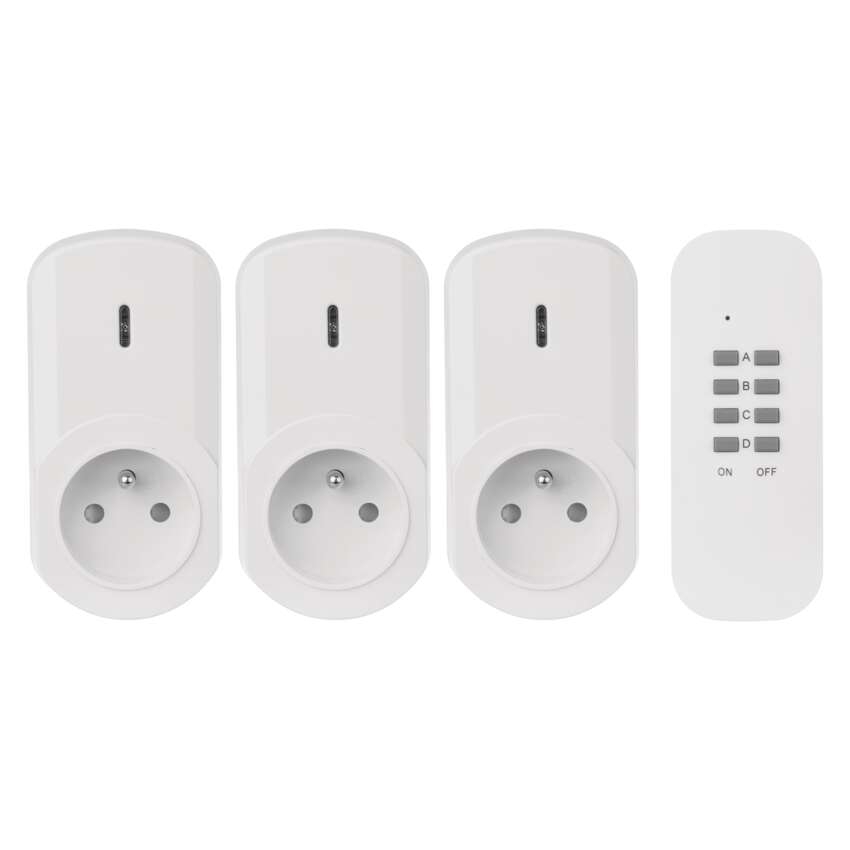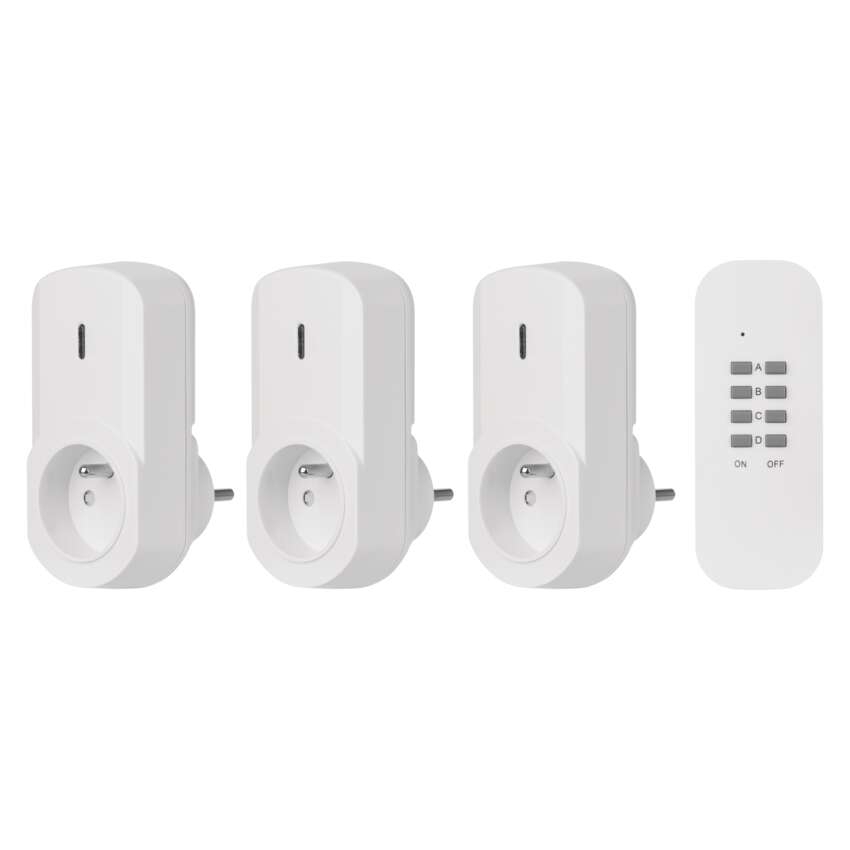 Dálkově ovládané zásuvky, bílé == barva: bílá|dálkový ovladač: napájení 1× CR2032 3 V (součástí balení)|dětské clonky: ano|dosah signálu: až 25 m ve volném prostoru|easy learning: manuální přiřazení zásuvek k ovladači|krytí: IP20|materiál: plast|max. zátěž: 1 000 W|možnost ovládání: až 4 zásuvky|napětí/proud: 230 V~/4,35 A max.|počet pólů: 2P + PE|počet zásuvek: 1× 2P + PE|pozice ochranného kontaktu: neuvádí se|přenosoná frekvence: 433,92 MHz|prodejní obal: 1 ks, krabička|produkt: dálkově ovládané zásuvky, 3 zásuvky + 1× dálkový ovladač|typ: FRENCH|venkovní použití: ne|vypínač: ne
