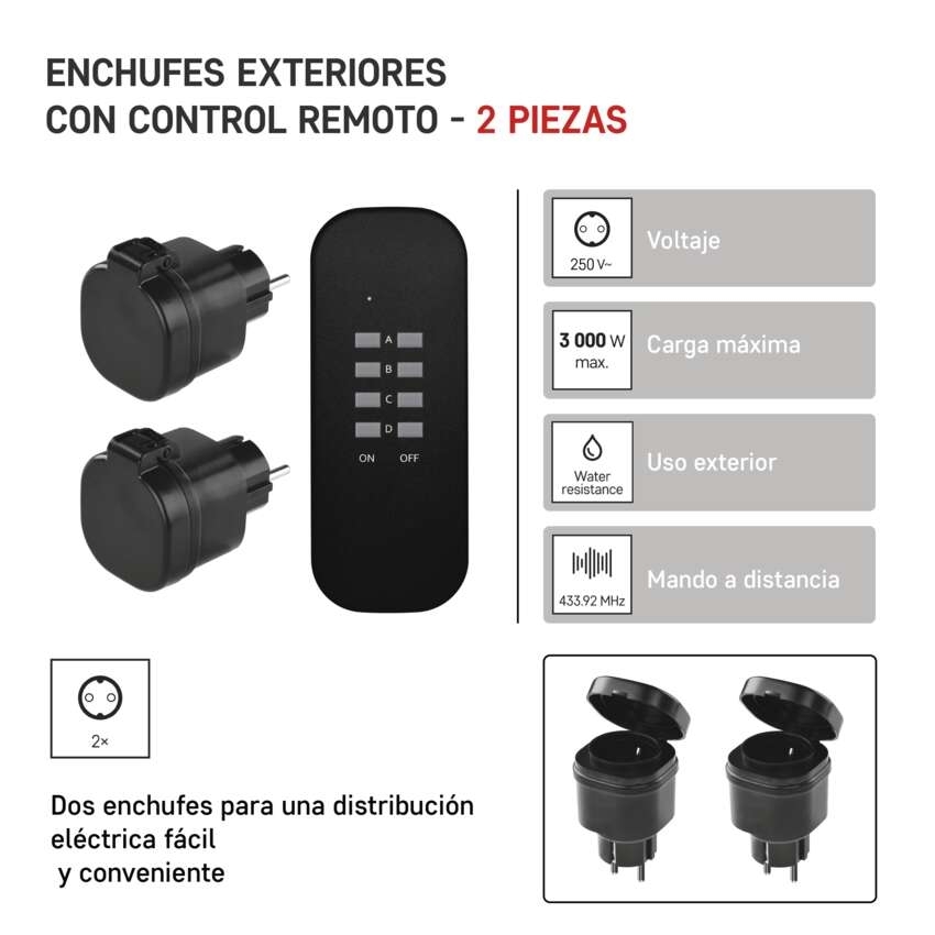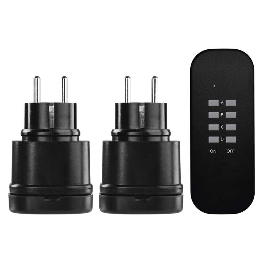 Dálkově ovládané zásuvky SCHUKO, IP44 == barva: černá|dálkový ovladač: napájení 1× CR2032 3 V (součástí balení)|dětské clonky: ano|dosah signálu: až 30 m ve volném prostoru|easy learning: není nutné párování zásuvek a žádná instalace, zásuvka se spáruje s ovladačem automaticky po stlačení tlačítka na dálkovém ovladači.|krytí: IP44|materiál: plast|max. zátěž: 3 000 W|možnost ovládání: až 4 zásuvky|napětí/proud: 250 V~/13 A max.|počet pólů: neuvádí se|počet zásuvek: 1× 2P + PE|pozice ochranného kontaktu: neuvádí se|přenosoná frekvence: 433,92 MHz|prodejní obal: 1 ks, krabička|produkt: dálkově ovládané zásuvky, 2 zásuvky + 1× dálkový ovladač|typ: SCHUKO|venkovní použití: ano|vypínač: ne