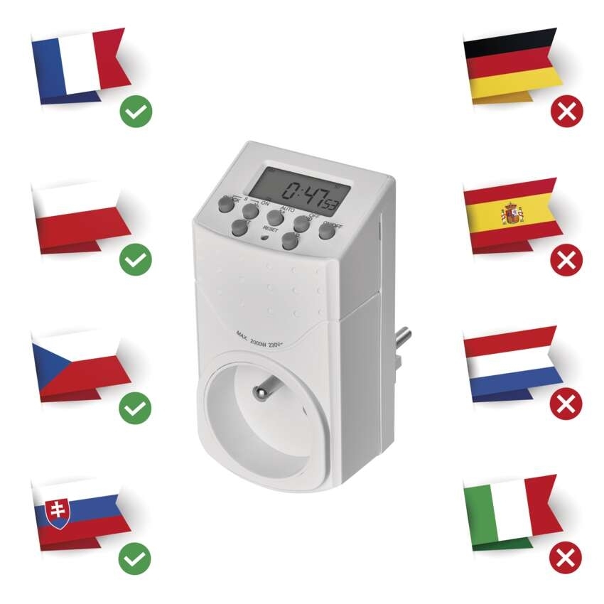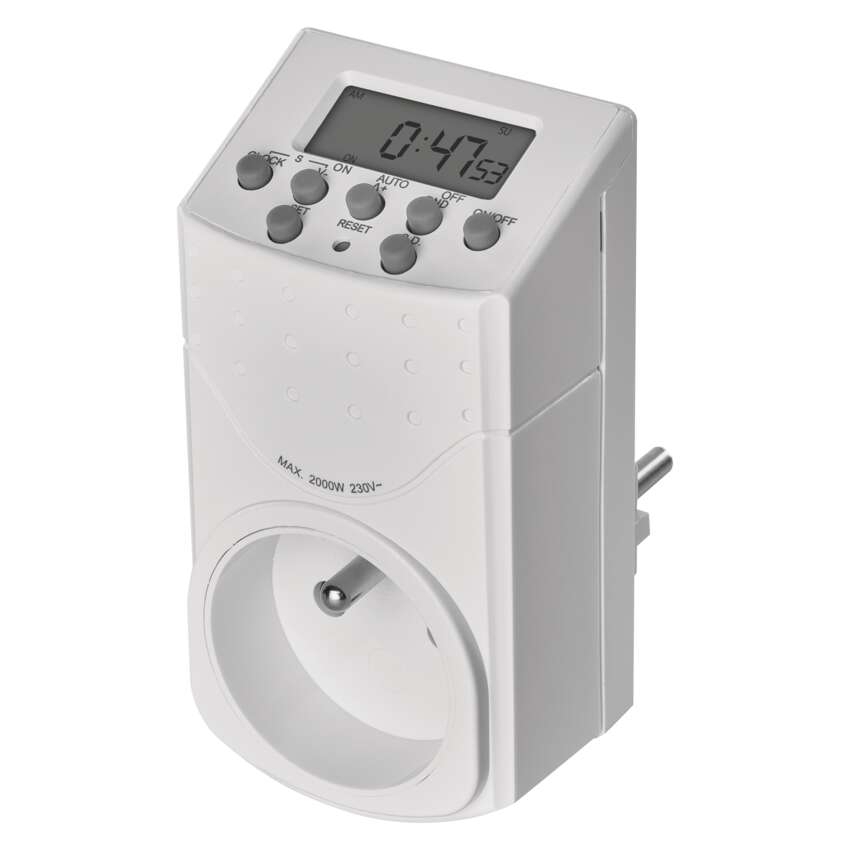 Časovač – digitální spínací zásuvka IP20 == dětské clonky: ano|druh: digitální|funkce odpočítávání countdown: ano|funkce změny letní/zimní čas: ano|krytí: IP20|max. zátěž: 2 000 W|minimální doba sepnutí: 1 minuta|možnost ručního zapnutí: ano|napětí/proud: 230 V~/8,7 A max.|počet programů: 20|počet spínání za den: 20|prodejní obal: 1 ks, blistr|rozměr: 53 × 100 × 71 mm|spíná: nulový vodič|venkovní použití: ne|záložní akumulátor: 1,2 V; 40 mAh; NiMH(knoflíková baterie 1× 1,2 V)