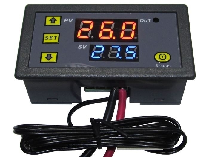 Krátkým stiskem tlačítka RESTART se termostat zapne, dlouhým stiskem se vypne. Krátkým stiskem tlačítka SET lze po rozblikání displeje nastavit šipkami nahoru a dolů požadovanou teplotu. Dlouhým stiskem tlačítka SET a následně šipkami lze nastavit další funkce termostatu: