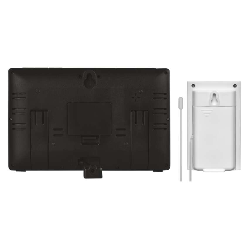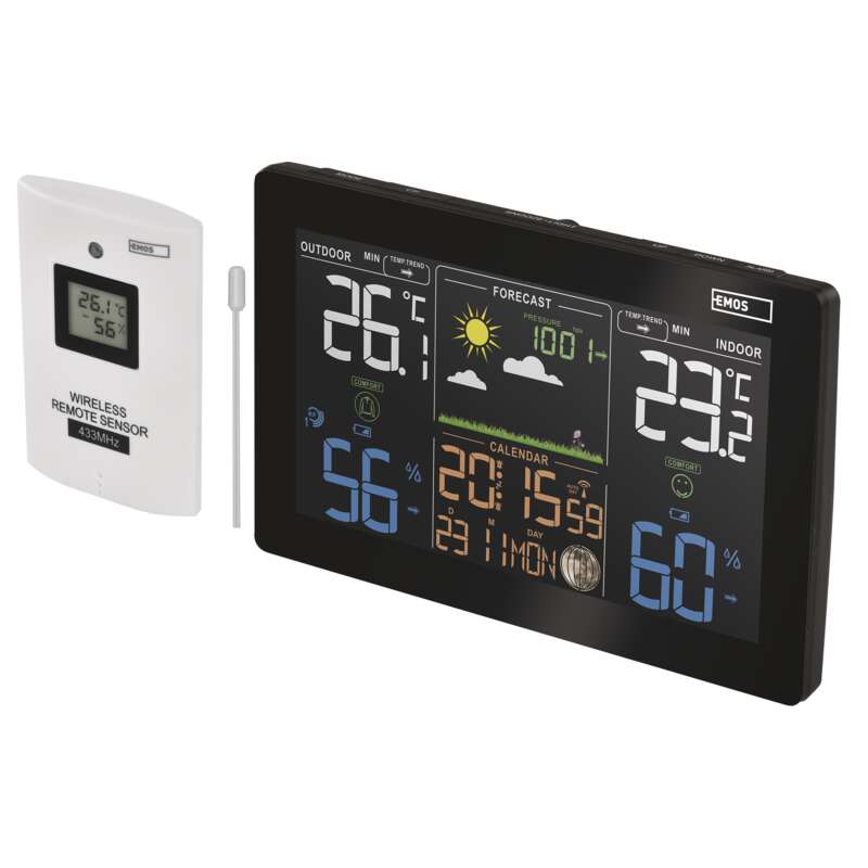 Domácí bezdrátová meteostanice E5111 == 12/24 formát času: ano|anemometr: ne|barevný displej (black mask) podsvícený: ano|barometr: ano|budík: ano, 2×|časová pásma: ano|datum: ano|dosah čidla: až 50 m|drátová sonda k čidlu: ano|elektronické plošné podsvícení: ano|fáze měsíce: ano|hodiny: řízené DCF signálem|kalendář: ano|korekce nadmořské výšky: ne|LED podsvícení displeje: ano|min. a max. teplota: ano|možné další čidlo: až 3 čidla (E05018)|možnost nastavení jednotky teploty: °C/°F|možnost pověšení na zeď: ano|napájení čidla: 2× 1,5 V AAA (nejsou součástí balení)|napájení stanice: 3× 1,5 V AAA (nejsou součástí balení)|opakované buzení: ano|předpověď počasí: ano|přenosová frekvence: 433 MHz|prodejní obal: 1 ks, krabička|produkt: meteostanice|projekce: ne|provedení: bezdrátové|rozměr čidla: 21 × 60 × 100 mm|rozměr hlavní jednotky: 26 × 197 × 125 mm|síťový adaptér: ano, 5 V DC/600 mA (součástí balení)|srážkoměr: ne|teplotní výstraha: ne|trend teploty: ano|trend tlaku: ano|trvalé podsvícení: ano|velikost displeje: 164 × 90 mm|venkovní teplota: -40 °C až +70 °C, rozlišení 0,1 °C|venkovní vlhkost: 20 % až 95 % RV, rozlišení 1 %|vnitřní teplota: -10 °C až +50 °C, rozlišení 0,1 °C|vnitřní vlhkost: 1 % až 99 % RV, rozlišení 1 %