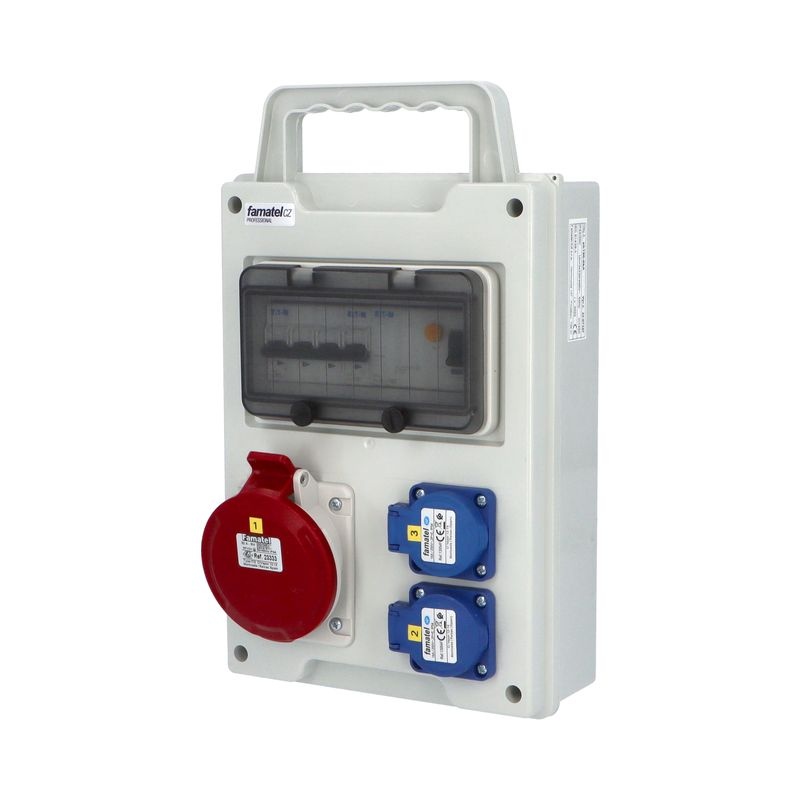 Přenosná zásuvková skříň FAMATEL eb190-6kA-EB200010.1 /8M IP44 jištěná s chráničem 40/4/003, zásuvky 2x230V, 1x32/5, přístroje EATON 6kA: 1xPL6-B16/1, 1xPL6-B32/3, PF6-40/4/003 na vstupu, použité pouzdro: 6201-20 (8mod.) - 355x215x85mm, barva: světle šedá.
