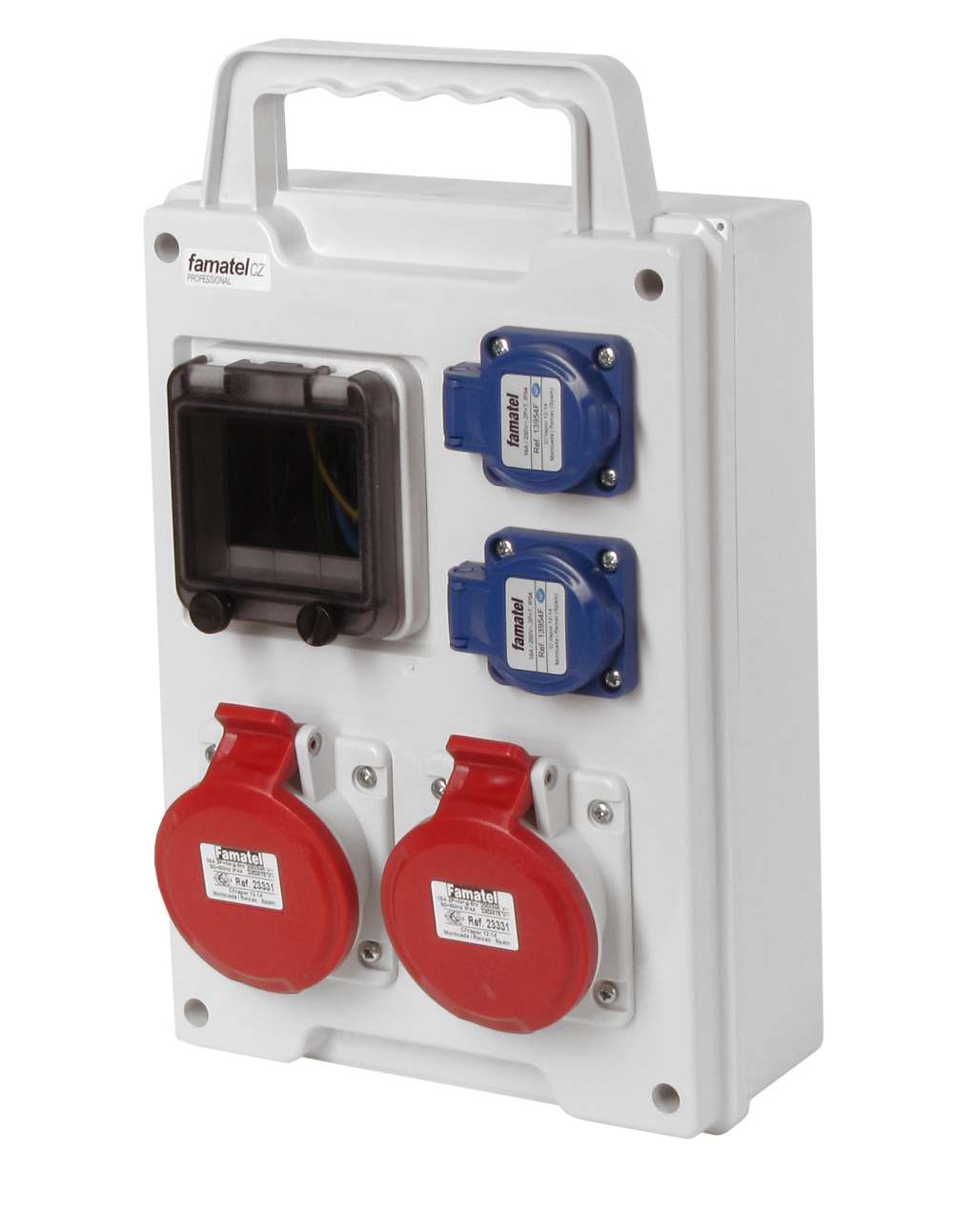 Přenosná zásuvková skříň FAMATEL eb400-EB 202000.V /4M IP44 pouze vydrátovaná, zásuvky 2x230V, 2x16/5, použité pouzdro: 6201-10 (4mod.) - 355x215x85mm, barva: světle šedá.