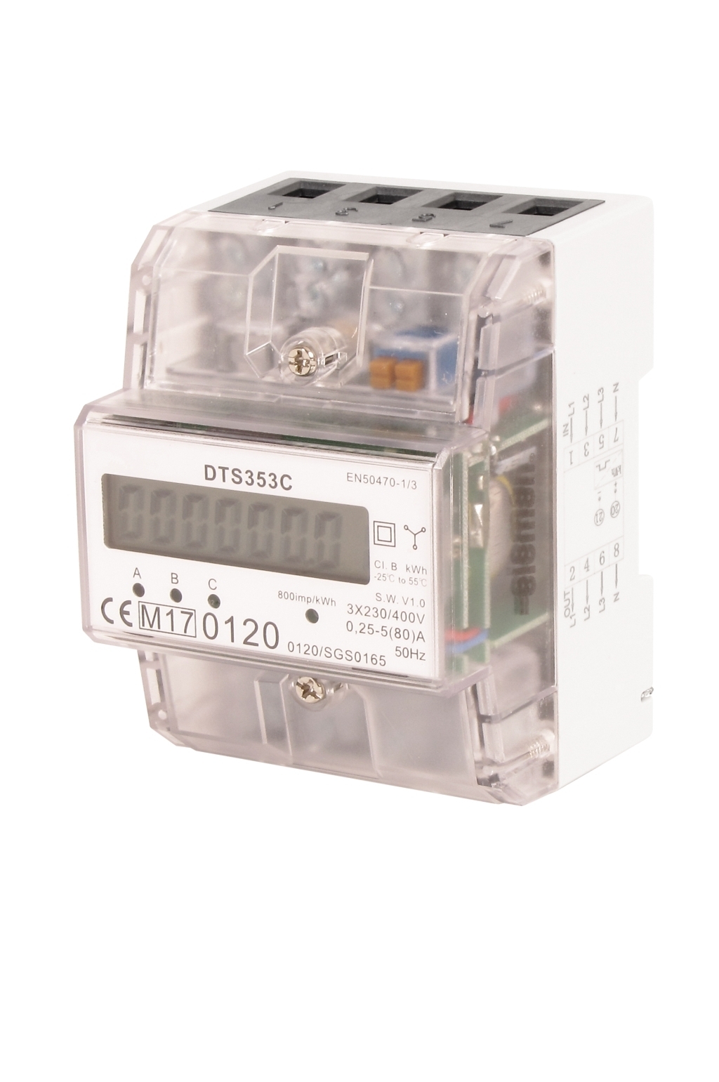 Podružný 3-fázový 1-tarifní digitální elektroměr pro přímé fakturační měření DTS 353C 80A MID, 4,5mod. (certifikace MID).