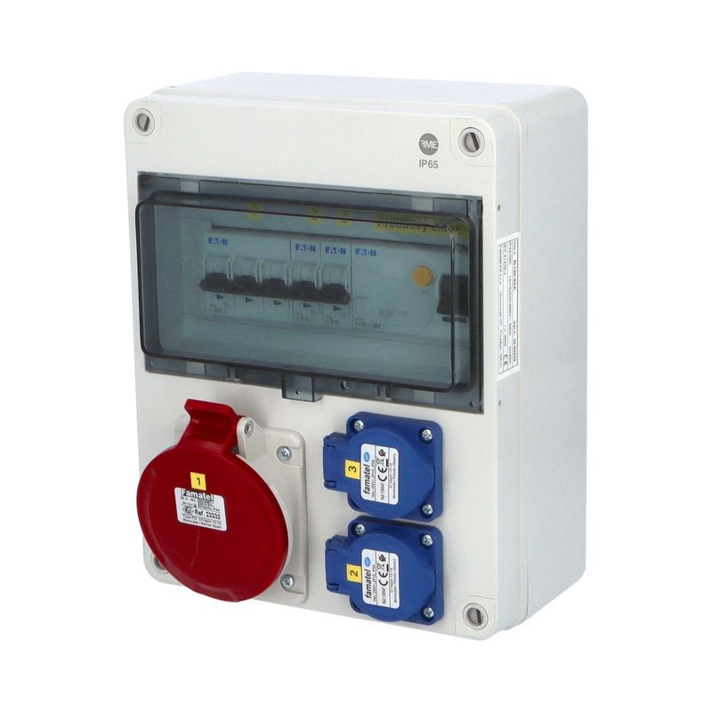 Zásuvková skříň FAMATEL fb190-6kA - ZSF20001000.1 /5810 IP44 jištěná s chráničem 40/4/003, zásuvky 2x230V (natočené), 1x32/5, přístroje EATON 6kA: 2xPL6-B16/1, 1xPL6-B32/3, PF6-40/4/003 na vstupu, použité pouzdro: 5810 - 270x220x120mm, barva: světle šedá.