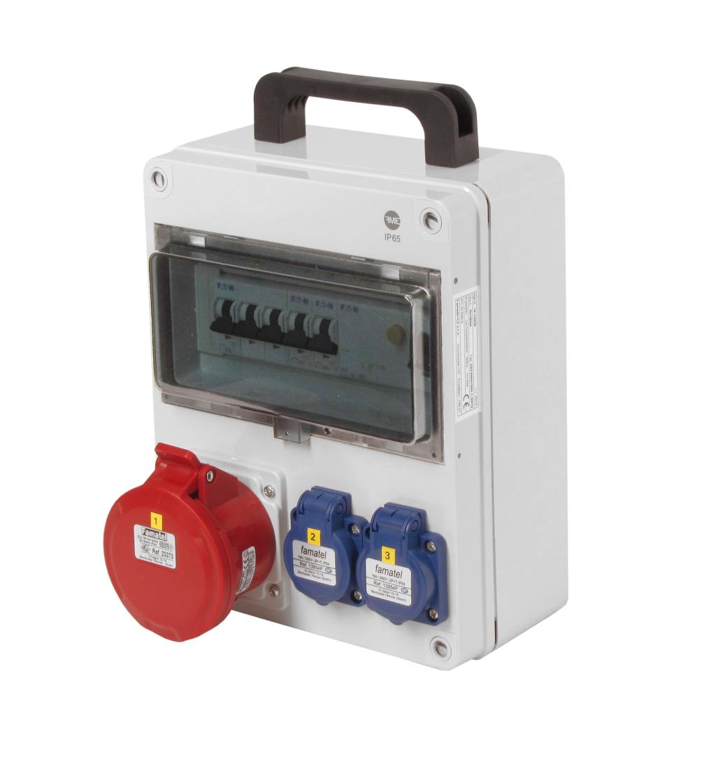 Zásuvková skříň FAMATEL fb19005-6kA - ZSF20001000.1 /5810 IP44 jištěná s chráničem 40/4/003, zásuvky 2x230V, 1x32/5 (přímá), přístroje EATON 6kA: 2xPL6-B16/1, 1xPL6-B32/3, PF6-40/4/003 na vstupu, použité pouzdro: 5810 - 270x220x120mm, barva: světle šedá. Držadlo součástí.