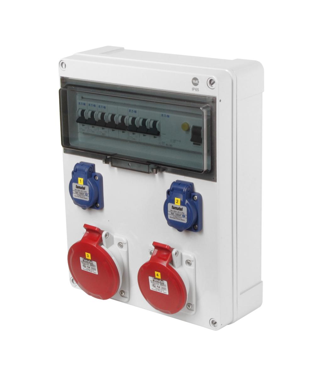 Zásuvková skříň FAMATEL fb310-6kA - ZSF20101000.1 /5813 IP44 jištěná s chráničem 40/4/003, zásuvky 2x230V, 1x16/5, 1x32/5, přístroje EATON 6kA: 2xPL6-B16/1, 1xPL6-B16/3, 1xPL6-B32/3, PF6-40/4/003 na vstupu, použité pouzdro: 5813 - 340x270x120mm, barva: světle šedá.