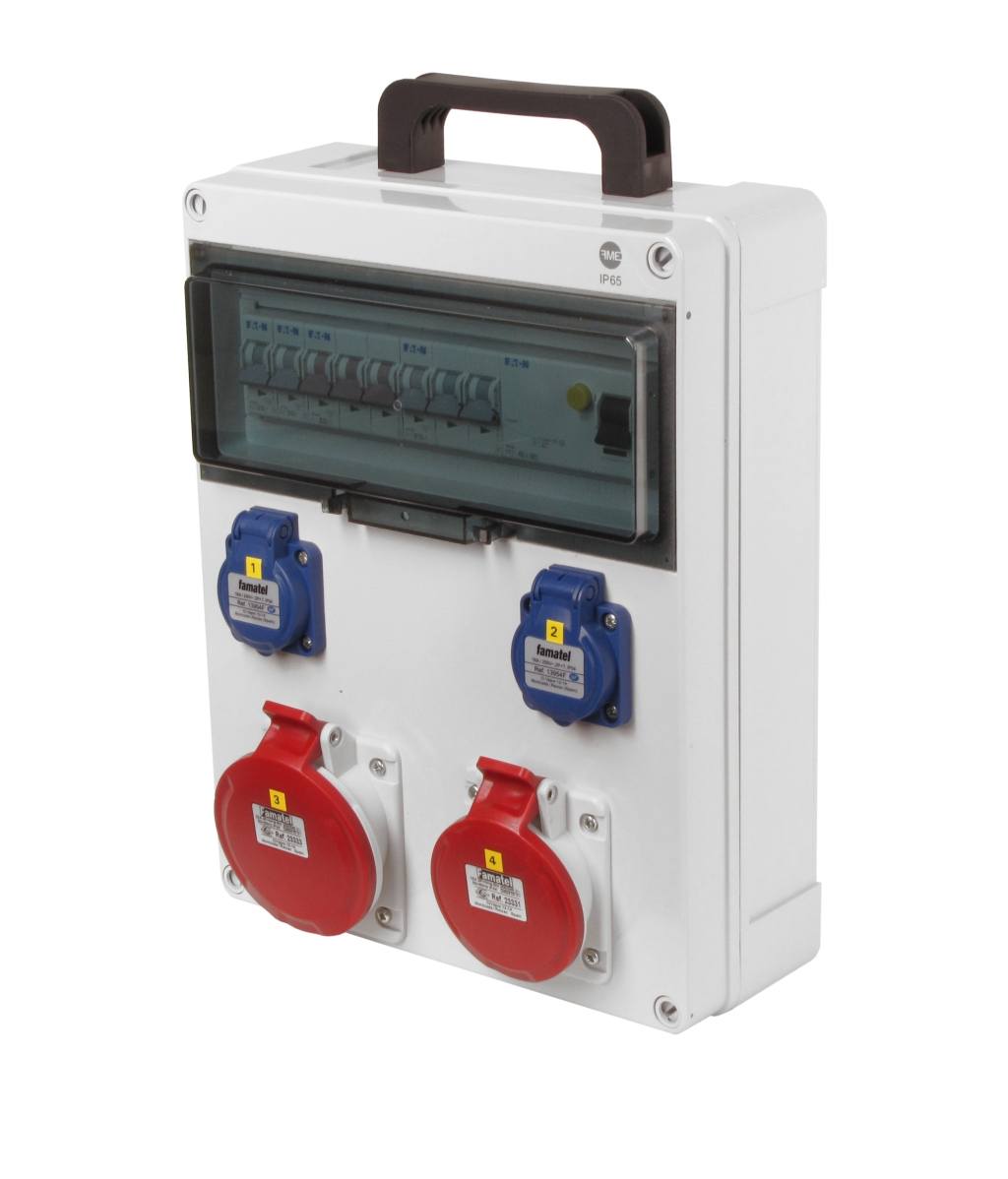 Zásuvková skříň FAMATEL fb31005 - ZSF20101000.1 /5813 IP44 jištěná s chráničem 40/4/003, zásuvky 2x230V, 1x16/5, 1x32/5, přístroje EATON 10kA: 2xPL7-B16/1, 1xPL7-B16/3, 1xPL7-B32/3, PF7-40/4/003 na vstupu, použité pouzdro: 5813 - 340x270x120mm, barva: světle šedá. Držadlo součástí.