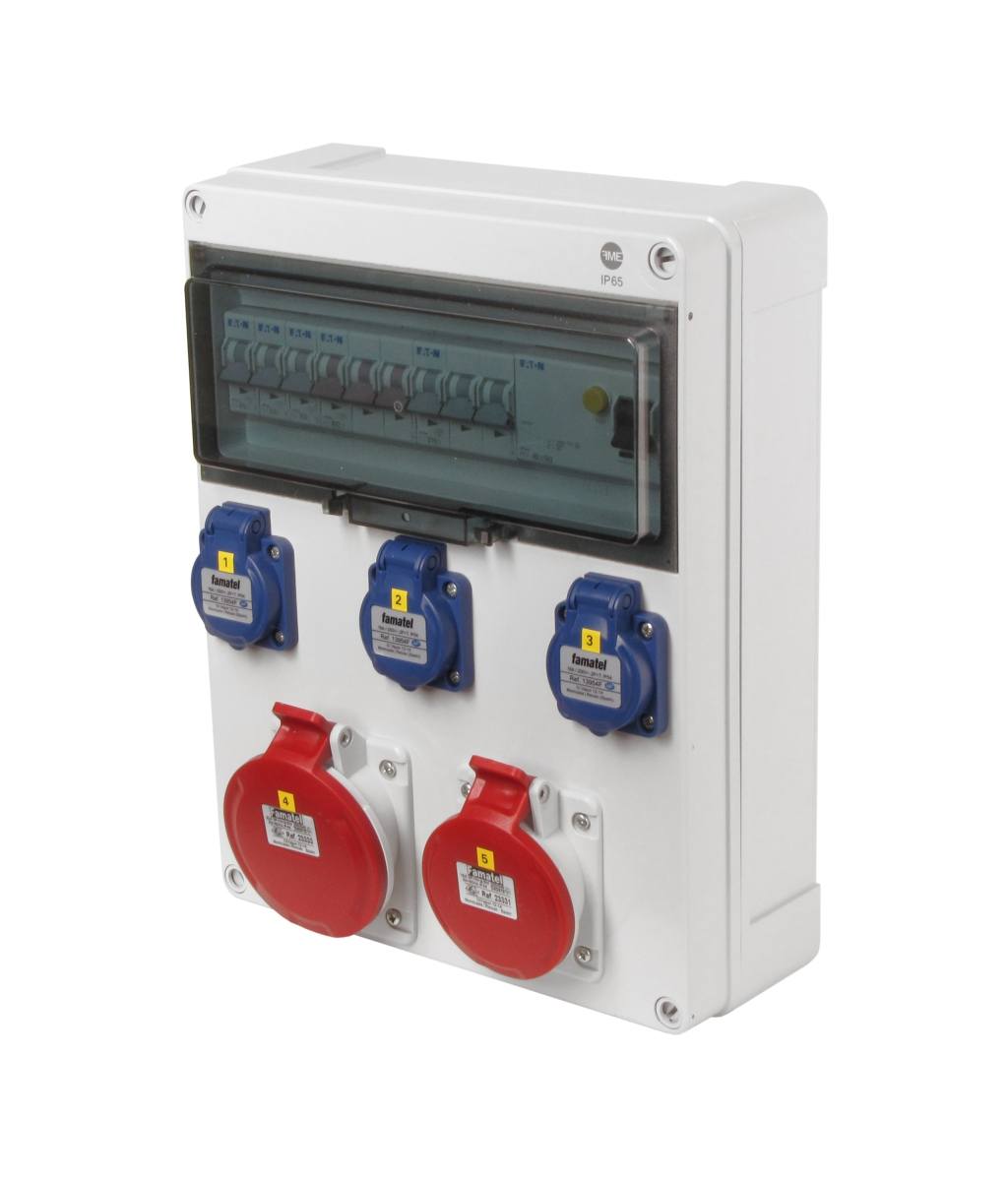 Zásuvková skříň FAMATEL fb32507 - ZSF30101000.1 /5813 IP44 jištěná s chráničem 40/4/003, zásuvky 3x230V, 1x16/5, 1x32/5, přístroje EATON 10kA: 3xPL7-B16/1, 1xPL7-B16/3, 1xPL7-B32/3, PF7-40/4/003 na vstupu, použité pouzdro: 5813 - 340x270x120mm, barva: světle šedá.