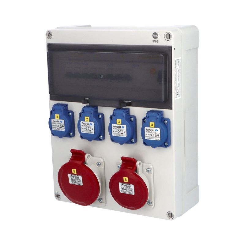 Zásuvková skříň FAMATEL fb340-6kA - ZSF40101000.1 /5813 IP44 jištěná s chráničem 40/4/003, zásuvky 4x230V, 1x16/5, 1x32/5, přístroje EATON 6kA: 2xPL6-B16/1, 1xPL6-B16/3, 1xPL6-B32/3, PF6-40/4/003 na vstupu, použité pouzdro: 5813 - 340x270x120mm, barva: světle šedá.