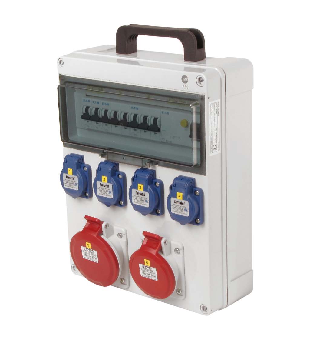 Zásuvková skříň FAMATEL fb34005-6kA - ZSF40101000.1 /5813 IP44 jištěná s chráničem 40/4/003, zásuvky 4x230V, 1x16/5, 1x32/5, přístroje EATON 6kA: 2xPL6-B16/1, 1xPL6-B16/3, 1xPL6-B32/3, PF6-40/4/003 na vstupu, použité pouzdro: 5813 - 340x270x120mm, barva: světle šedá. Držadlo součástí.