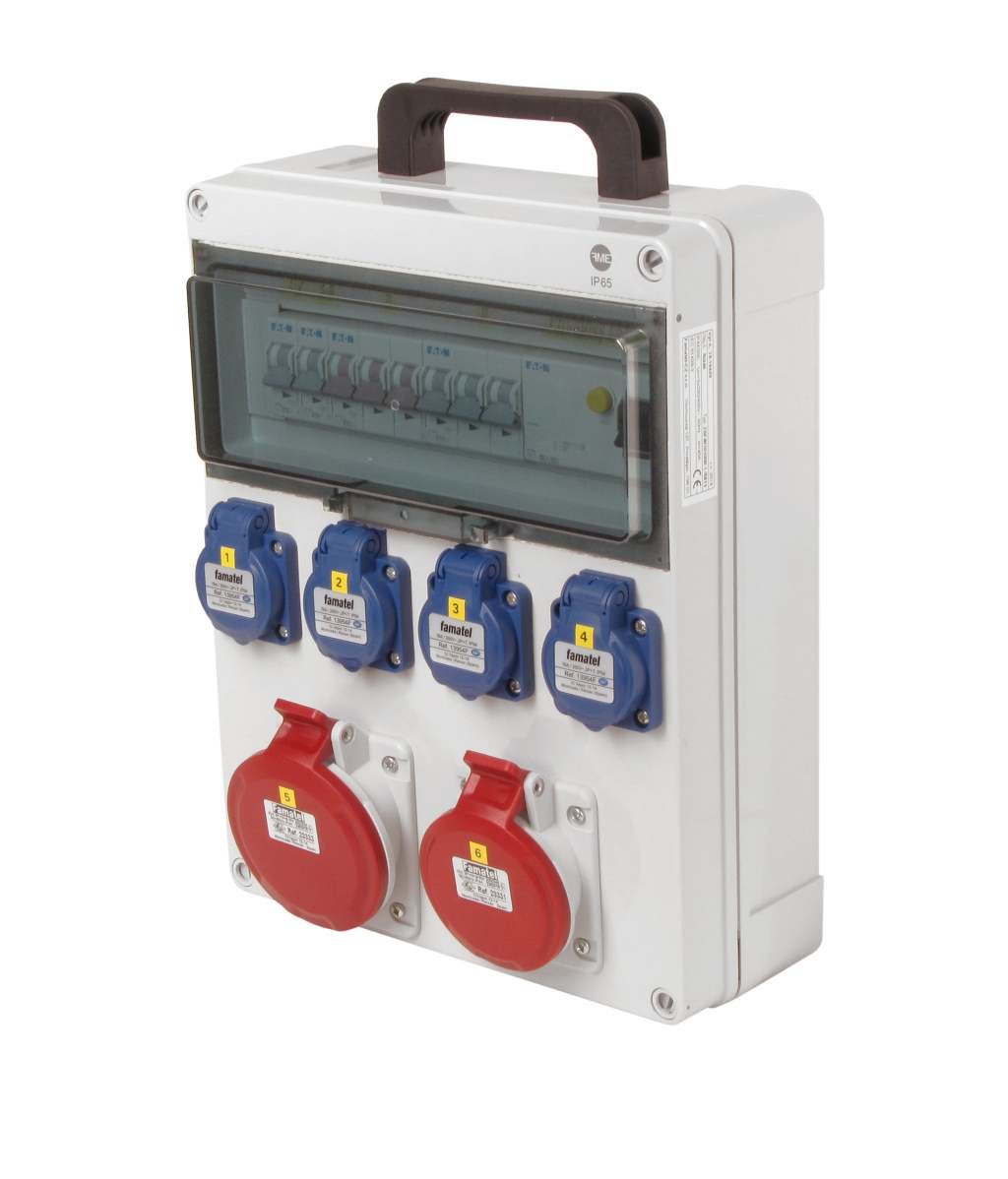 Zásuvková skříň FAMATEL fb34005 - ZSF40101000.1 /5813 IP44 jištěná s chráničem 40/4/003, zásuvky 4x230V, 1x16/5, 1x32/5, přístroje EATON 10kA: 2xPL7-B16/1, 1xPL7-B16/3, 1xPL7-B32/3, PF7-40/4/003 na vstupu, použité pouzdro: 5813 - 340x270x120mm, barva: světle šedá. Držadlo součástí.