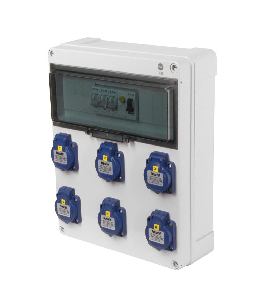 Zásuvková skříň FAMATEL fb373 - ZSF60000000.1 /5813 IP54 jištěná s chráničem 25/2/003, zásuvky 6x230V, přístroje EATON 10kA: 3xPL7-B16/1, PF7-25/2/003 na vstupu, použité pouzdro: 5813 - 340x270x120mm, barva: světle šedá.