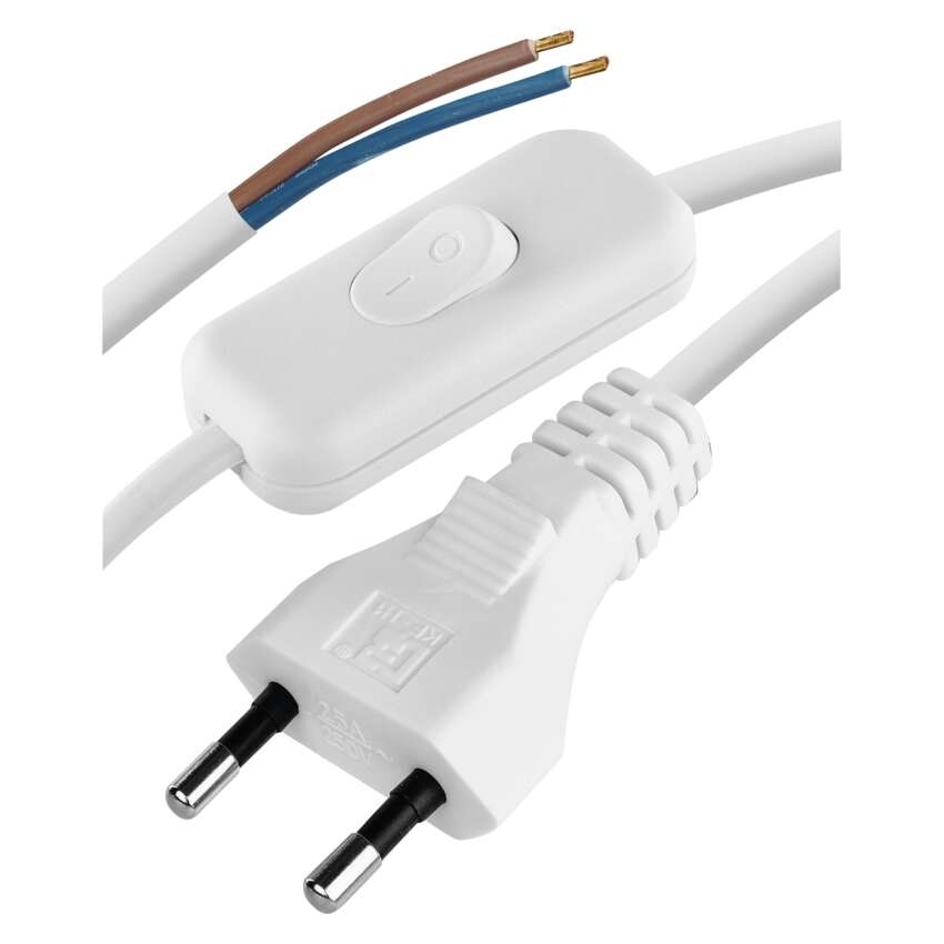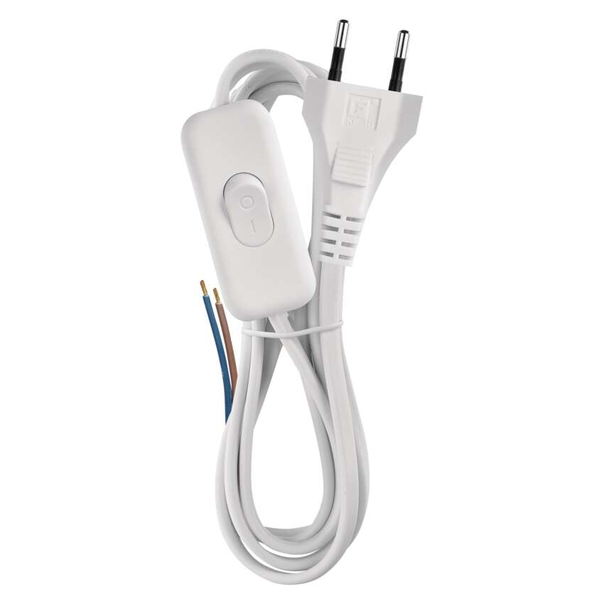 Flexo šňůra PVC 2× 0,75mm2 s vypínačem, 2m, bílá == barva: bílá|délka: 2 m|prodejní obal: 1 ks, závěs|průřez vodiče: 2× 0,75 mm?|typ: KF-H1/S051E4|typ izolace: PVC|vodič: H03VVH2-F|vypínač: ano (50 cm od volného konce)