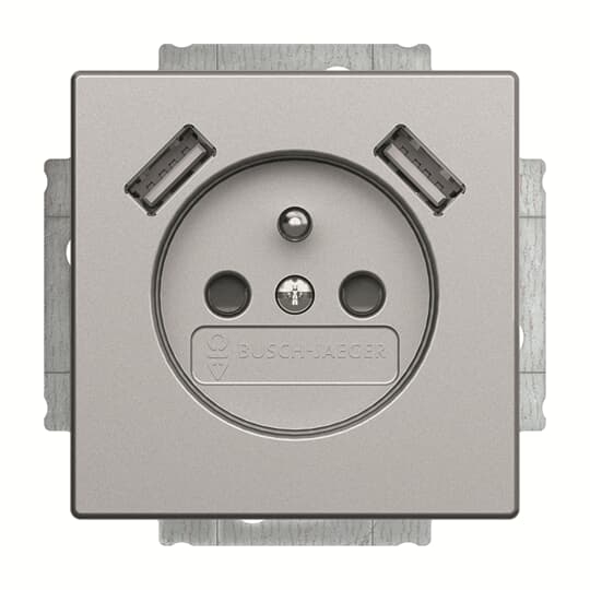Zásuvka 1násobná s kolíkem, s clonkami, s nabíjením 2x USB; hliníková stříbrná; 20 MUCB2USB-83-500 Vhodné pro designy z vypínačových řad ABB : Fu,Ax Objednací číslo : 2CKA002017A1890