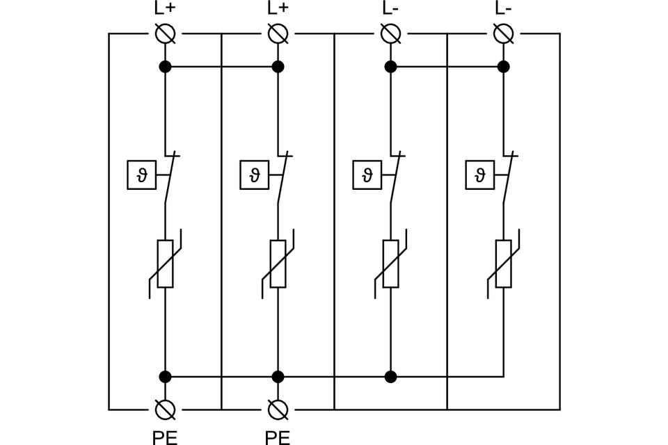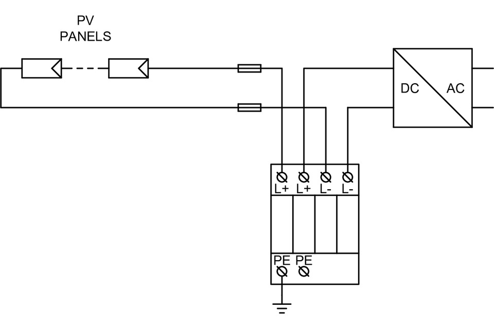 Svodiče impulzních proudů a rázového přepětí typu T1+T2 pro fotovoltaické (PV) systémy v U nebo Y zapojení. Výhodou zapojení Y oproti U je odolnost vůči zemnímu spojení pracovních vodičů a nulový reziduální (svodový) proud vodičem PE. Jednotlivé varistorové sekce zapojené mezi svorky L+, L- a PE jsou opatřeny interními odpojovači, které jsou aktivovány při poruše (přehřátí) varistorů. Tyto výrobky je nutné předjistit vnějším odpojovačem určeným pro PV aplikace. Instalují se na DC straně v PV aplikacích s vnějším LPS, kde není dodržena dostatečná vzdálenost „s“. Jsou vhodné pro hladinu LPL I nebo II. Zajišťují vyrovnávání potenciálů plusových a mínusových sběrnic PV systémů a likvidaci transientních přepětí vznikajících při atmosférických výbojích (včetně přímého úderu blesku do PV systému) nebo spínacích procesech. Označení S specifikuje provedení s dálkovou signalizací. Instaluje se dle norem: ČSN EN 62305 ed. 2, IEC 61643-32:2017, ČSN CLC/TS 50539-12, ČSN 33 2000-7-712 ed. 2.