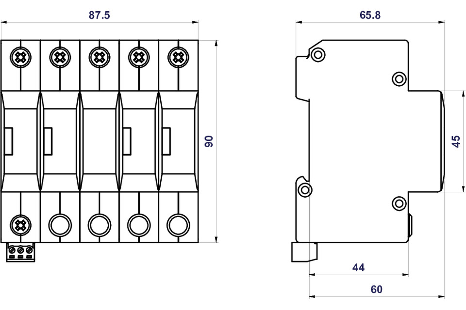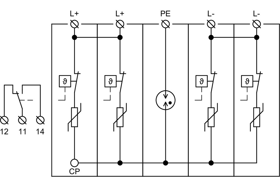 Svodiče impulzních proudů a rázového přepětí typu T1+T2 pro fotovoltaické (PV) systémy v U nebo Y zapojení. Výhodou zapojení Y oproti U je odolnost vůči zemnímu spojení pracovních vodičů a nulový reziduální (svodový) proud vodičem PE. Jednotlivé varistorové sekce zapojené mezi svorky L+, L- a PE jsou opatřeny interními odpojovači, které jsou aktivovány při poruše (přehřátí) varistorů. Tyto výrobky je nutné předjistit vnějším odpojovačem určeným pro PV aplikace. Instalují se na DC straně v PV aplikacích s vnějším LPS, kde není dodržena dostatečná vzdálenost „s“. Jsou vhodné pro hladinu LPL I nebo II. Zajišťují vyrovnávání potenciálů plusových a mínusových sběrnic PV systémů a likvidaci transientních přepětí vznikajících při atmosférických výbojích (včetně přímého úderu blesku do PV systému) nebo spínacích procesech. Označení S specifikuje provedení s dálkovou signalizací. Instaluje se dle norem: ČSN EN 62305 ed. 2, IEC 61643-32:2017, ČSN CLC/TS 50539-12, ČSN 33 2000-7-712 ed. 2.