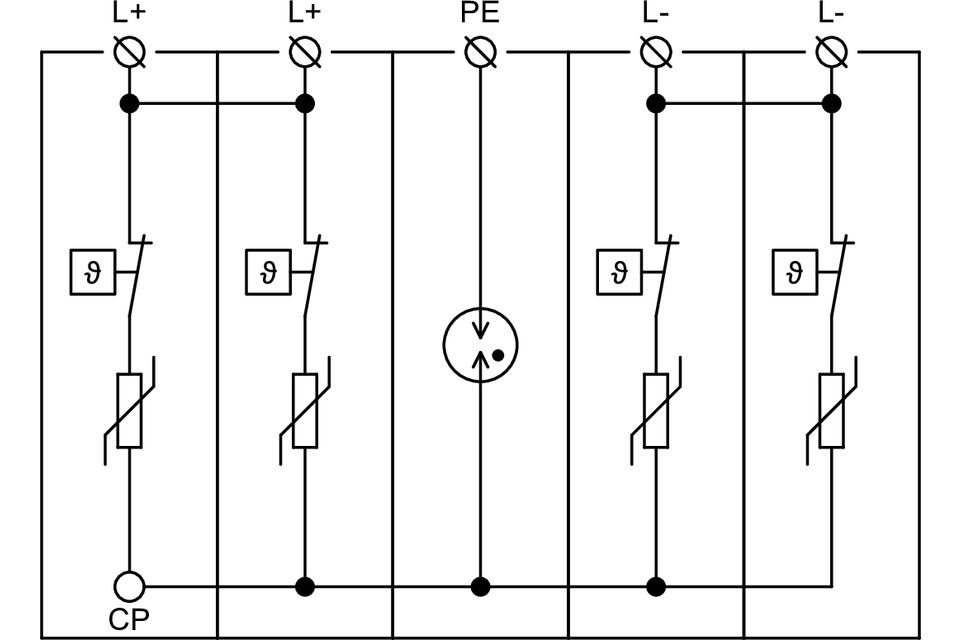 Svodiče impulzních proudů a rázového přepětí typu T1+T2 pro fotovoltaické (PV) systémy v U nebo Y zapojení. Výhodou zapojení Y oproti U je odolnost vůči zemnímu spojení pracovních vodičů a nulový reziduální (svodový) proud vodičem PE. Jednotlivé varistorové sekce zapojené mezi svorky L+, L- a PE jsou opatřeny interními odpojovači, které jsou aktivovány při poruše (přehřátí) varistorů. Tyto výrobky je nutné předjistit vnějším odpojovačem určeným pro PV aplikace. Instalují se na DC straně v PV aplikacích s vnějším LPS, kde není dodržena dostatečná vzdálenost „s“. Jsou vhodné pro hladinu LPL I nebo II. Zajišťují vyrovnávání potenciálů plusových a mínusových sběrnic PV systémů a likvidaci transientních přepětí vznikajících při atmosférických výbojích (včetně přímého úderu blesku do PV systému) nebo spínacích procesech. Označení S specifikuje provedení s dálkovou signalizací. Instaluje se dle norem: ČSN EN 62305 ed. 2, IEC 61643-32:2017, ČSN CLC/TS 50539-12, ČSN 33 2000-7-712 ed. 2.