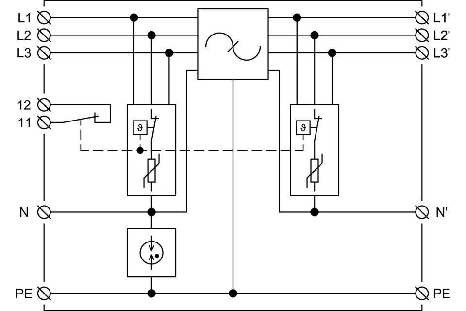 Třífázové dvoustupňové svodiče přepětí typu T2+T3 s vysokofrekvenčním filtrem pro sériové zapojení. Určeny pro ochranu elektronických zařízení proti účinkům spínacích, indukovaných a zbytkových přepětí v sítích nn. Dálková signalizace na bázi bezpotenciálového rozpínacího kontaktu. Libovolná poloha instalace bez vlivu na funkci a parametry. Montáž do rozvaděče pomocí čtyř šroubů M8. Označení S specifikuje provedení s dálkovou signalizací. Instaluje se dle norem: ČSN EN 62305 ed. 2, ČSN 33 2000-5-53 ed. 3, ČSN CLC/TS 61643-12.