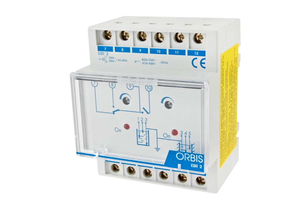 Hladinový spínač ORBIS EBR-2 - proud 6 (2)A / 8(1)A, napětí 230 V, 50 Hz, citlivost max 50 k ohmů, příkon 4 VA, počet snímačů 6, krytí IP20, montáž nad DIN.