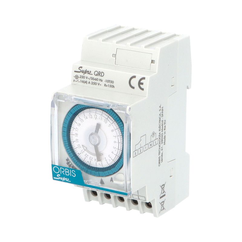 Hodiny spínací SUPRA QRD, analogové, denní, šířka 44mm (2,5 mod.), 230V 50-60Hz, se zálohou chodu 150 hodin, na DIN lištu, krytí IP20.