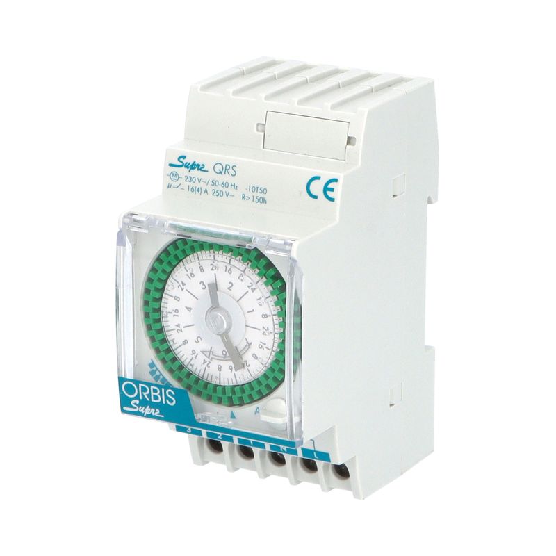 Hodiny spínací SUPRA QRS, analogové, týdenní, šířka 44mm (2,5 mod.), 230V 50-60Hz, se zálohou chodu 150 hodin, na DIN lištu, krytí IP20.
