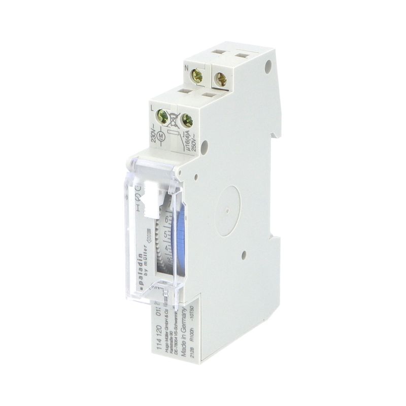 Hodiny spínací PALADIN 114120, analogové, denní, šířka 17,5mm (1 mod.), 230V 50-60Hz, se zálohou chodu, šedé, na DIN lištu, krytí IP20.