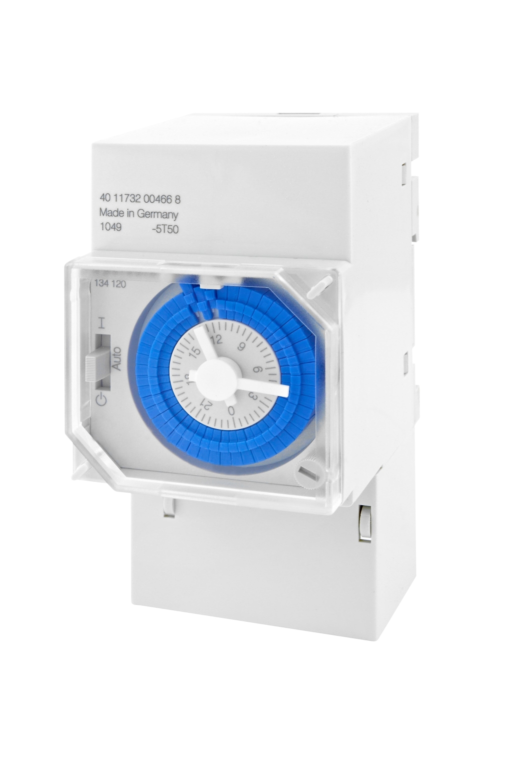 Hodiny spínací PALADIN 134120, analogové, denní, šířka 52,5mm (3 mod.), 230V 50-60Hz, se zálohou chodu, šedé, na DIN lištu, krytí IP20.