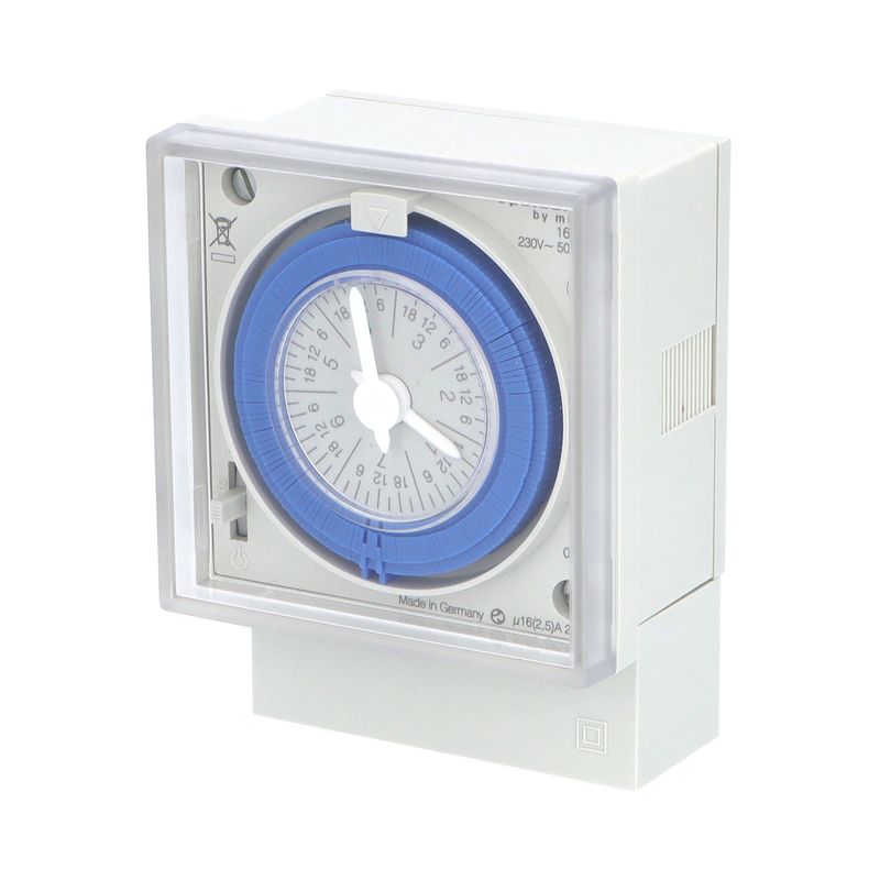 Hodiny spínací PALADIN 164420, analogové, týdenní, šířka 72 mm, montáž na panel, 230V 50-60Hz, se zálohou chodu, šedé, krytí IP20.