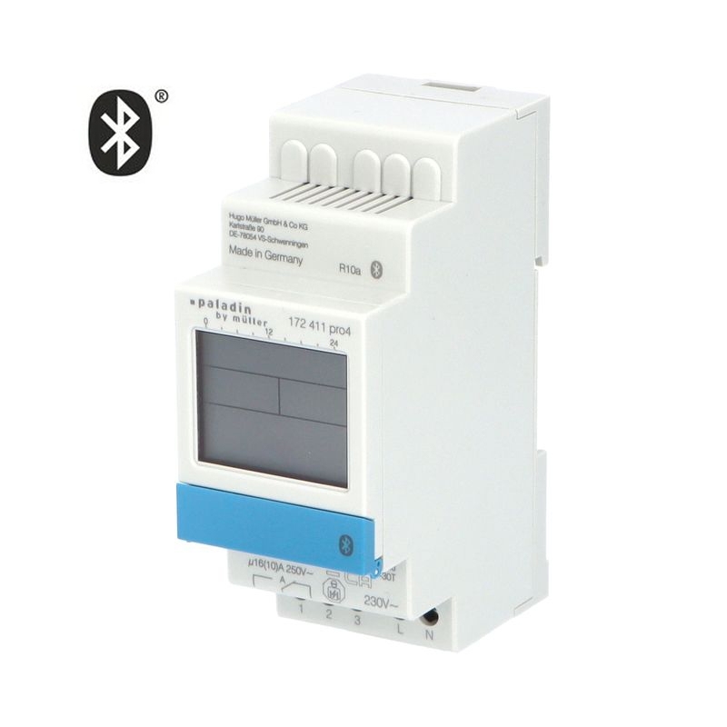 Hodiny spínací PALADIN 172411pro4, digitální, 1kan., 2mod., integrovaný Bluetooth - inovace, se zálohou, šedé, na DIN, týdenní program, 100 úložných míst.
