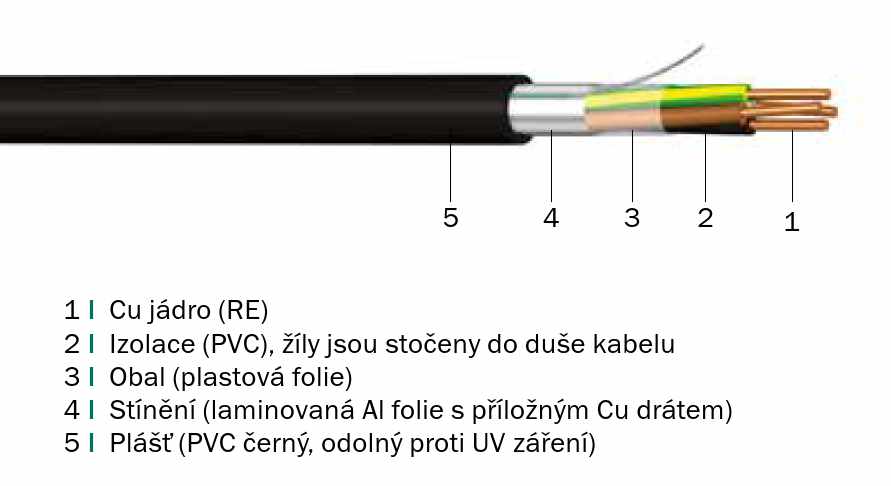 - Stínění (laminovaná Al folie s příložným Cu drátem)