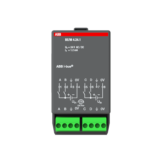 Modul binárního vstupu, 4násobný, 12/24 V AC/DV; BE/M4.24.1 Vhodné pro designy z vypínačových řad ABB : KNX Objednací číslo : 2CDG110006R0011