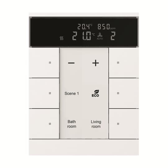 Tenton prvek ovládací 6násobný s ovládáním HVAC a snímačem CO2 a vlhkosti; mechová bílá; SBC/U6.0.1-884 Vhodné pro designy z vypínačových řad ABB : KNX Objednací číslo : 2CKA006330A0060