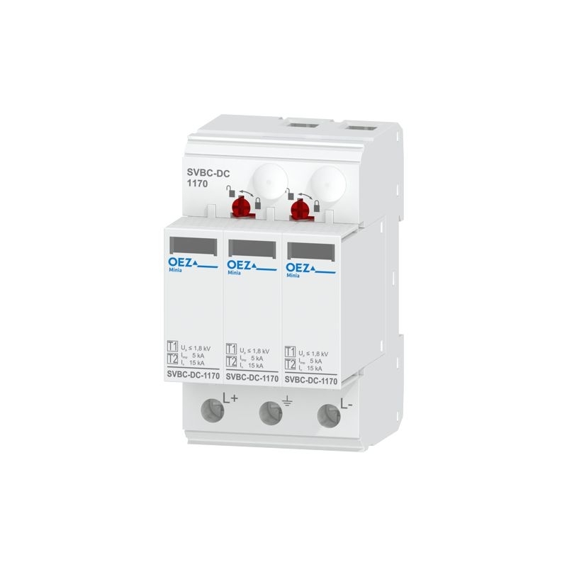 Kombinovaný svodič bleskových proudů a přepětí SVBC-DC-1170-3V-MZ typ 1+2, Iimp 5 kA, Uc DC 1170 V, zapojení Y, výměnné moduly, varistor OEZ:47524