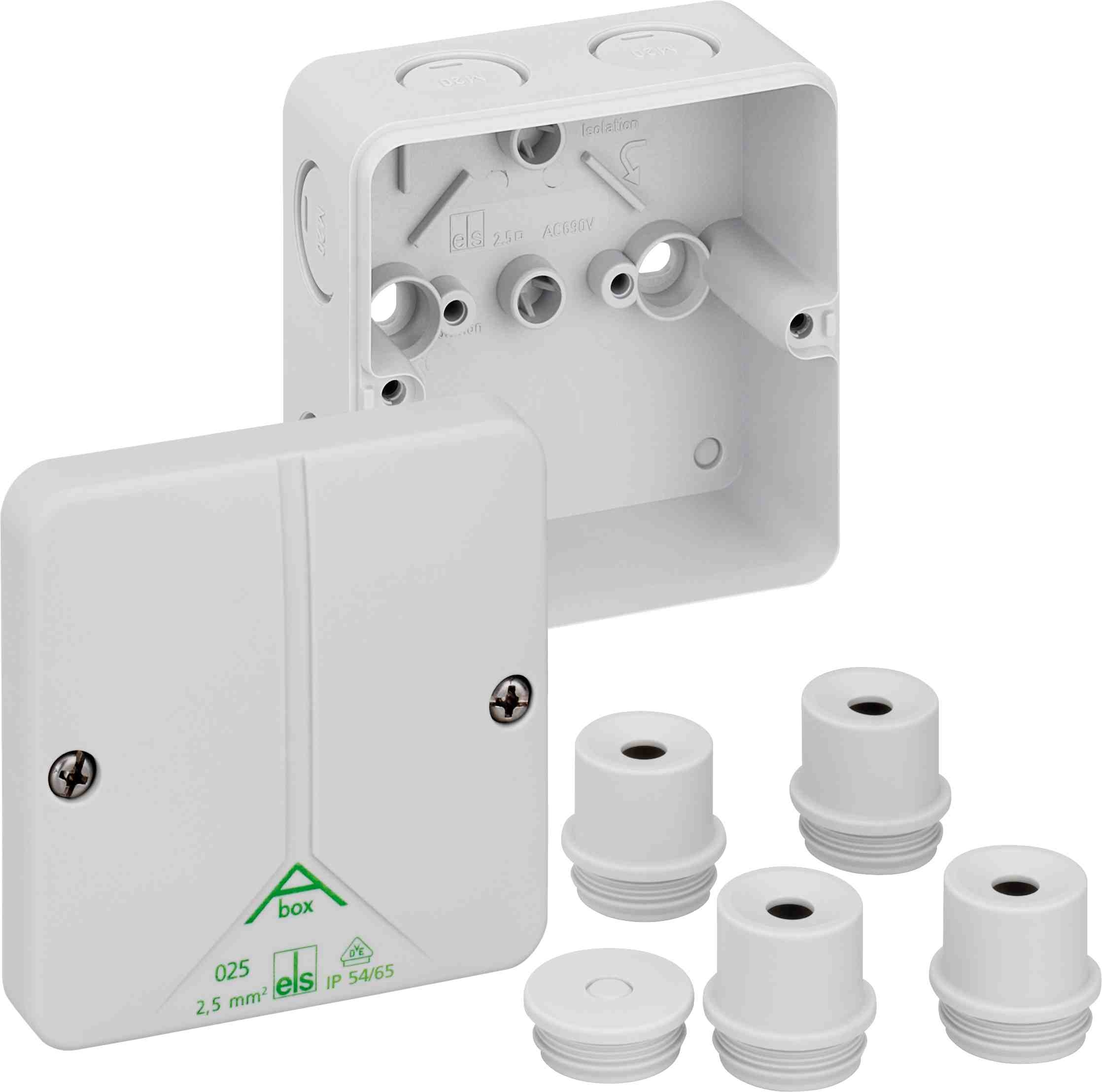 Rozbočovací krabice, se stupněm krytí IP54/IP65, Jmenovitý průřez 2,5 mm?, Ui=690V AC, Certifikováno VDE (DIN EN 60670-1/-22 (VDE 0606-1/-22)), Vyrážecí membrány, M20, (1 Zpětné, 7 bočně), Vnitřní místa pro připevnění, pro standardní instalace ve vnitřním prostoru, šedá, bez svorek Rozměry: 82 x 82 x 52 mm Přiložené příslušenství: 4 Vývodka IP54 M20 Rozsah těsnění 8 - 13,5 mm, 1 Zaslepovací zátky M20